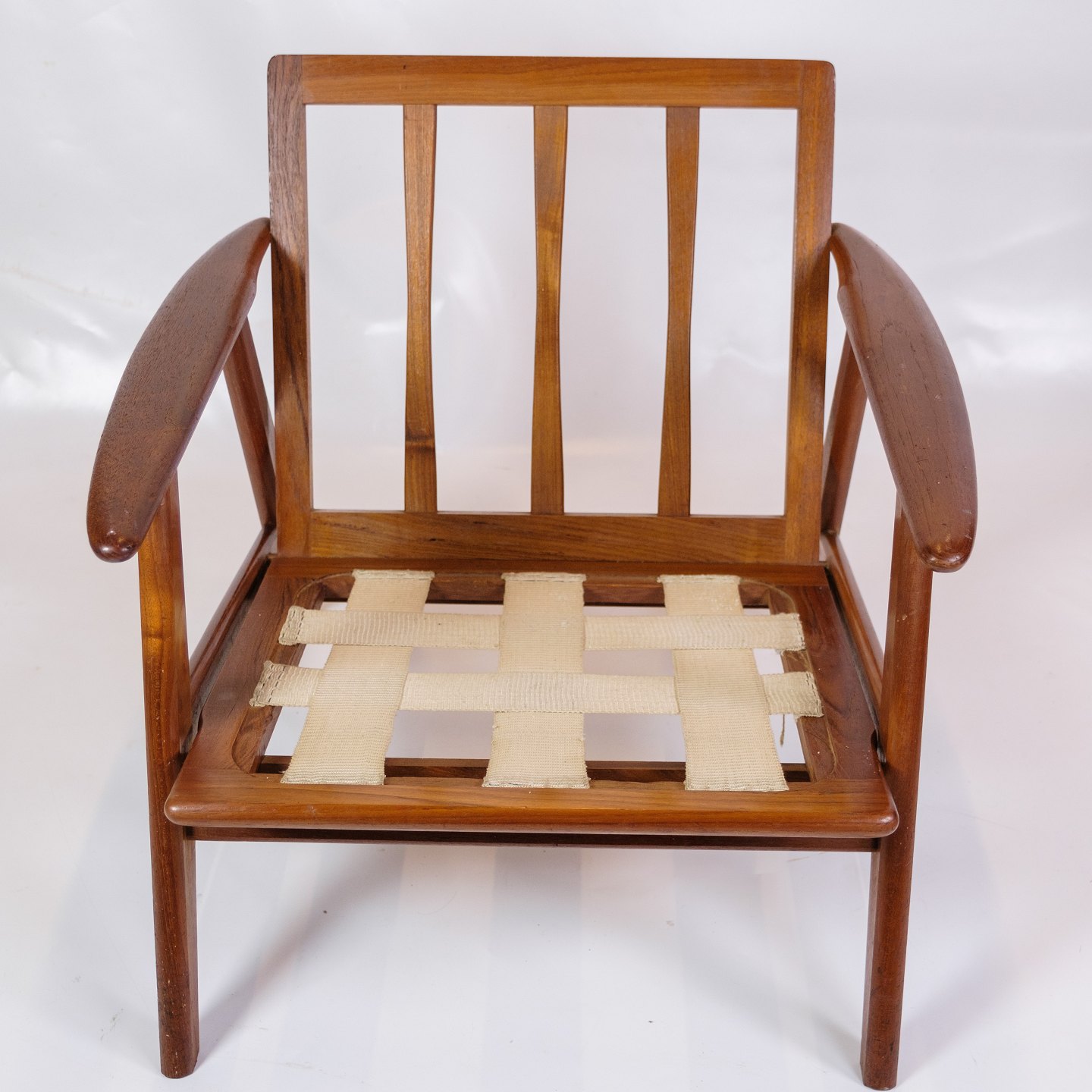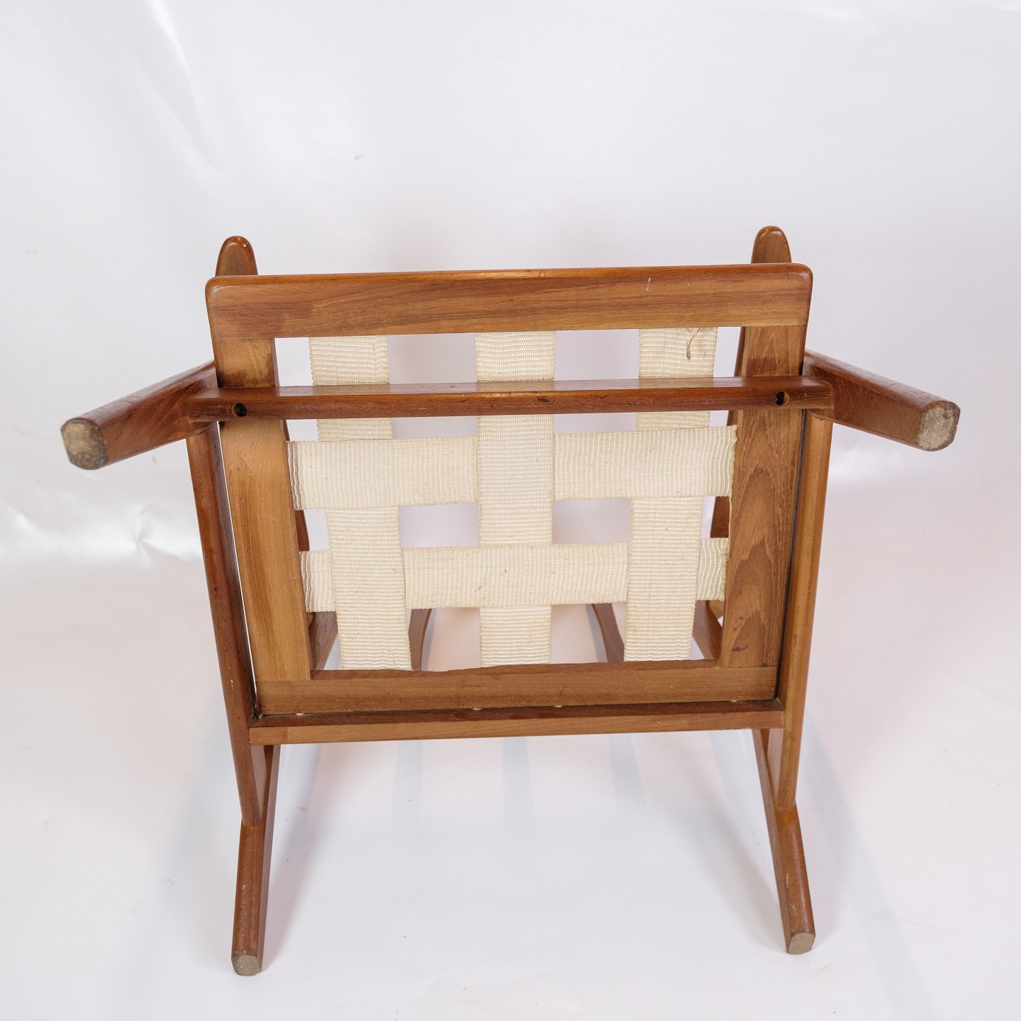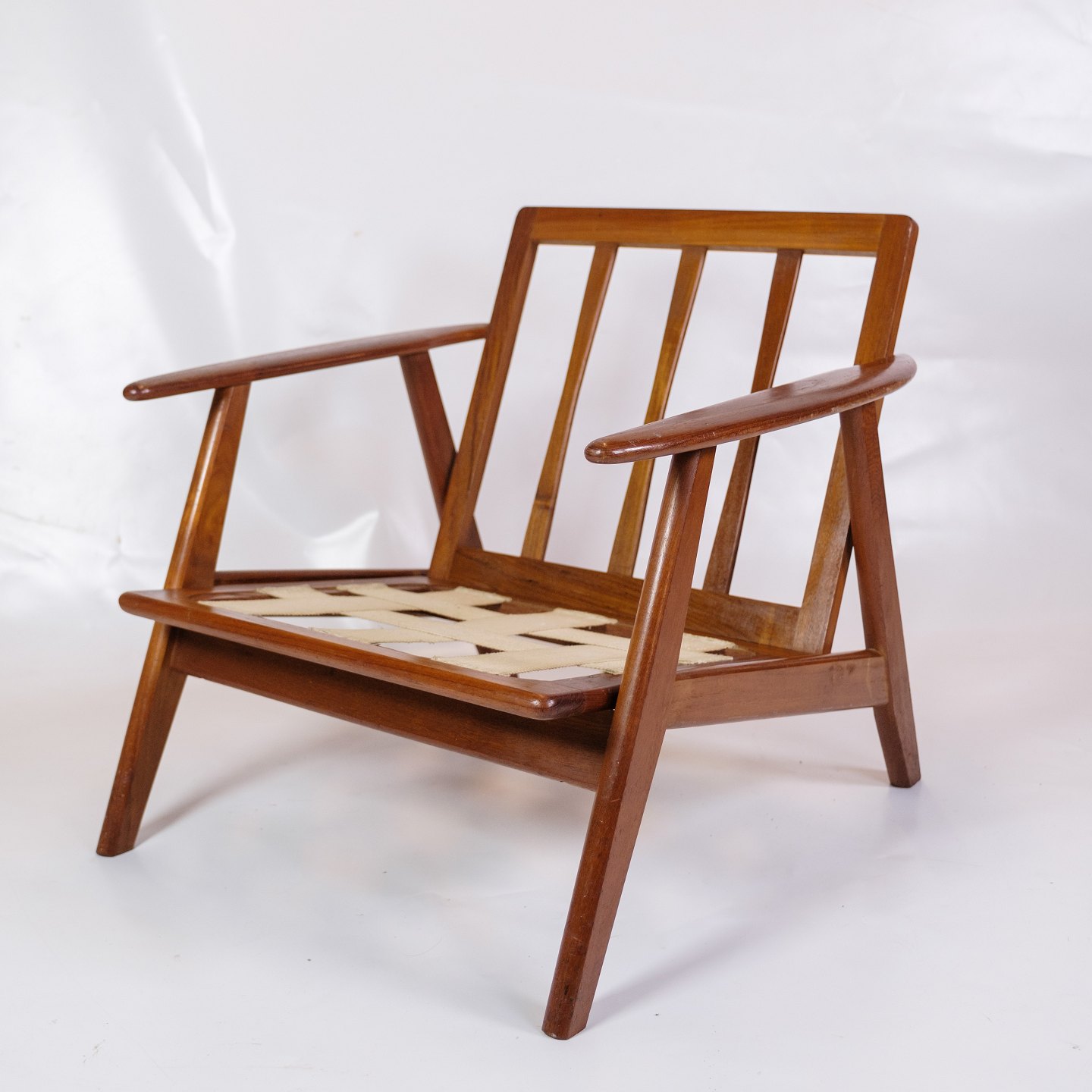 Denne lænestol fra 1960'erne er et fremragende eksempel på dansk design fra midten af det 20. århundrede. Stolen er fremstillet af teaktræ og betrukket med grønt stof, hvilket kombinerer naturlige materialer med tidens farvetrends.