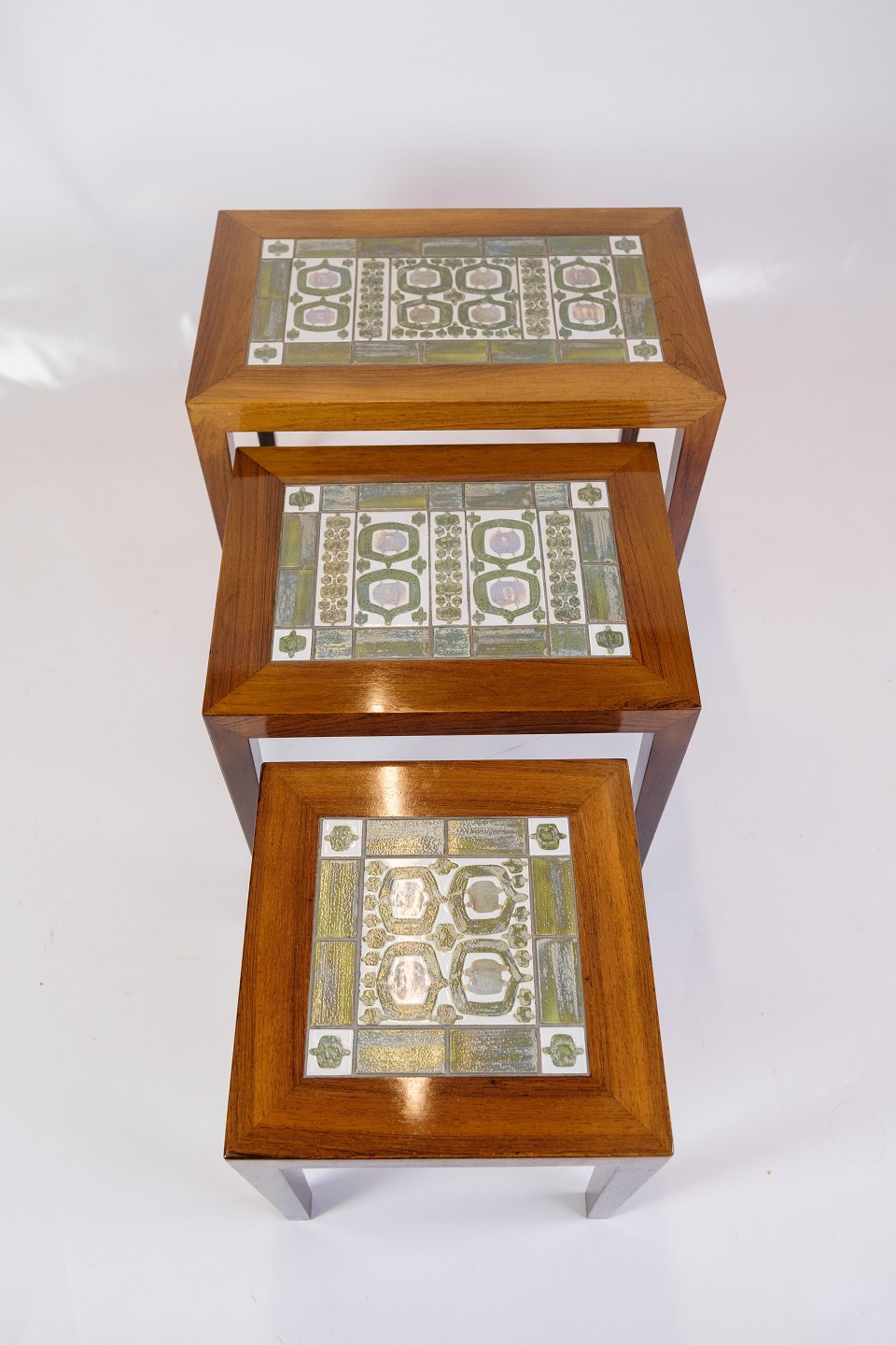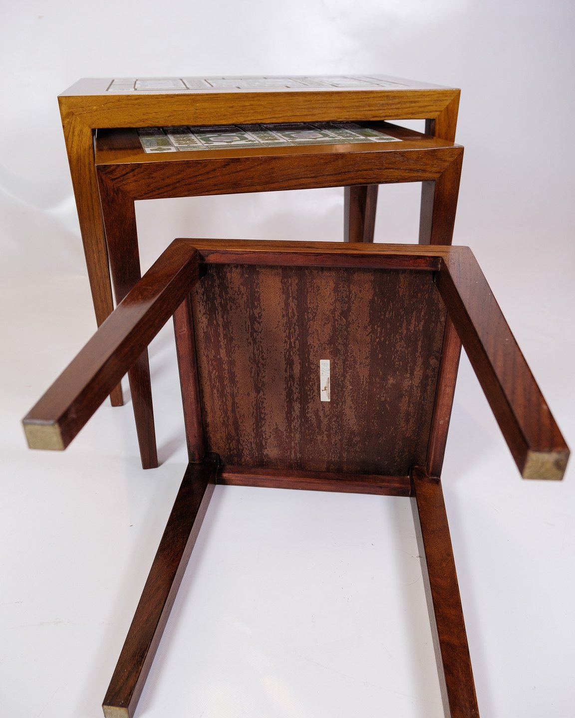 The Royal Copenhagen tiles add an extra dimension of sophistication and artistic value to the tables. The tiles are known for their fine porcelain and detailed, hand-painted decorations. The combination of rosewood and the decorative tiles creates a harmonious balance between functionality and aesthetics.
