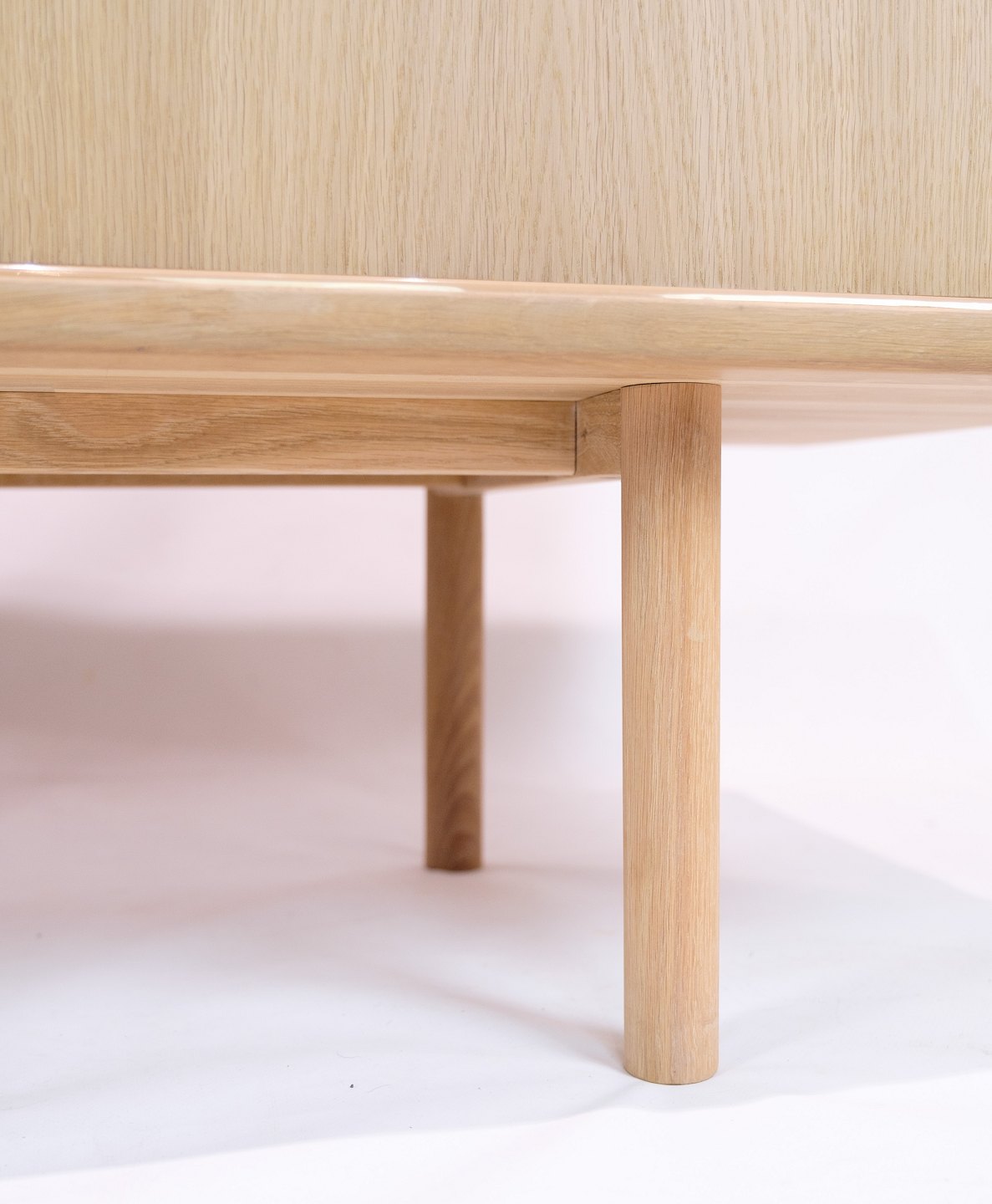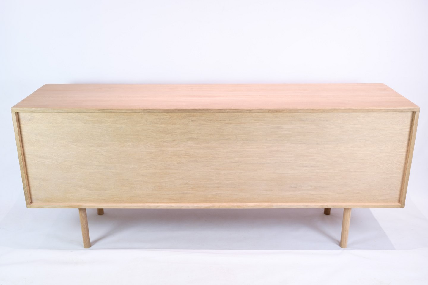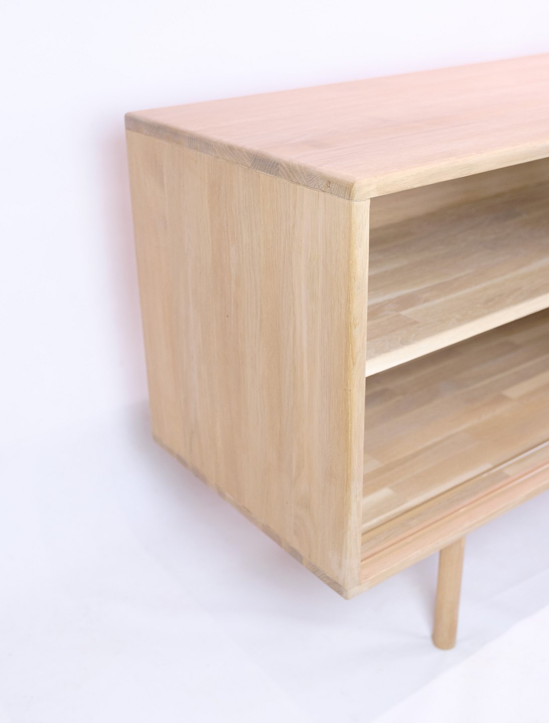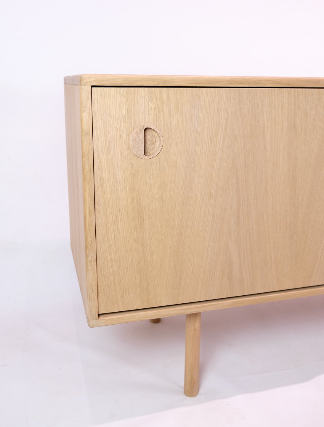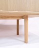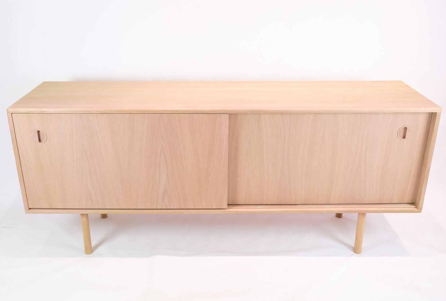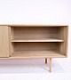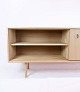 Smuk egetræs skænk af lys sæbebehandlet egetræ med skydelåger og greb med stil af Kurt Østervig fra 1970'erne. Skænken har indvendige hylder og runde ben.