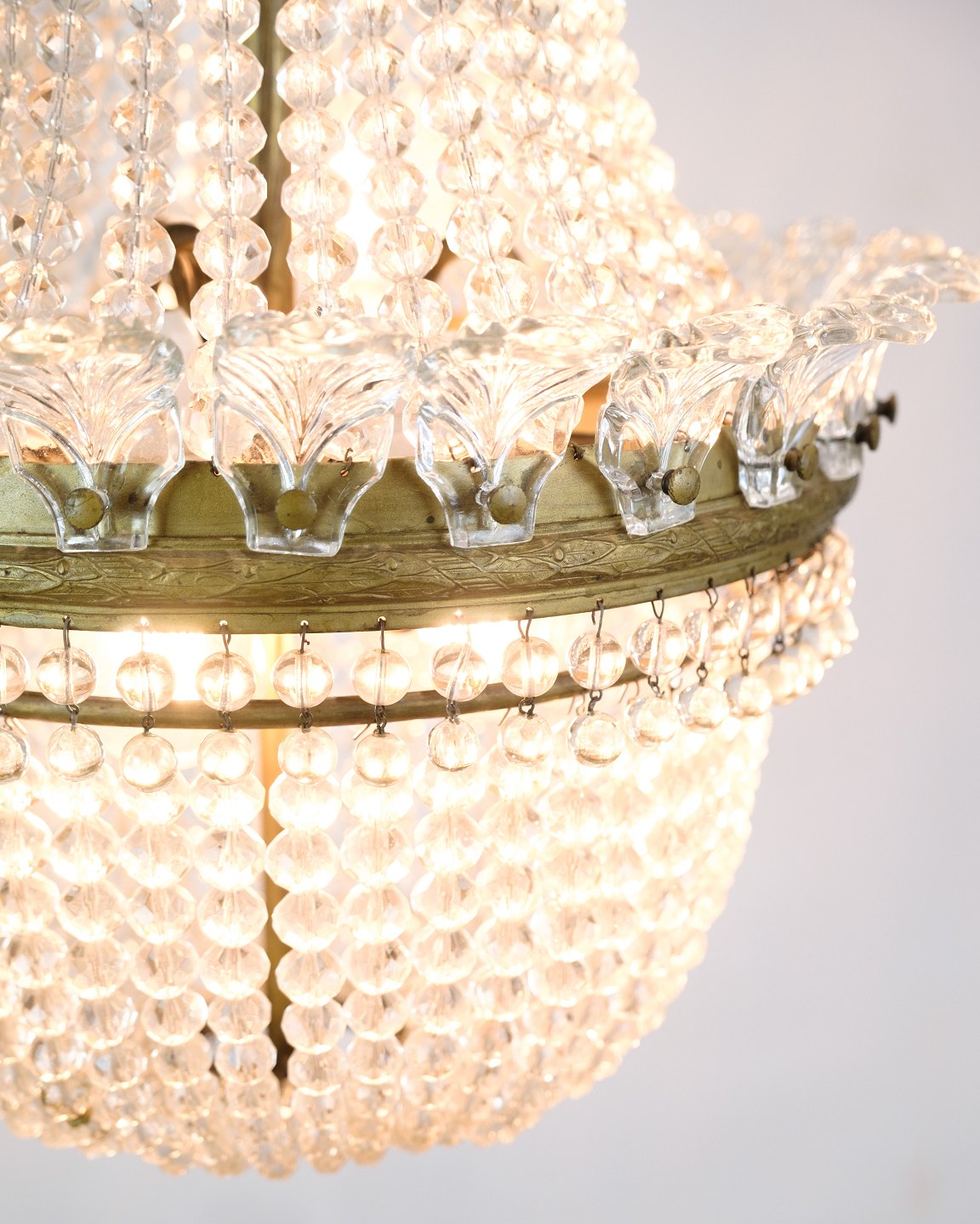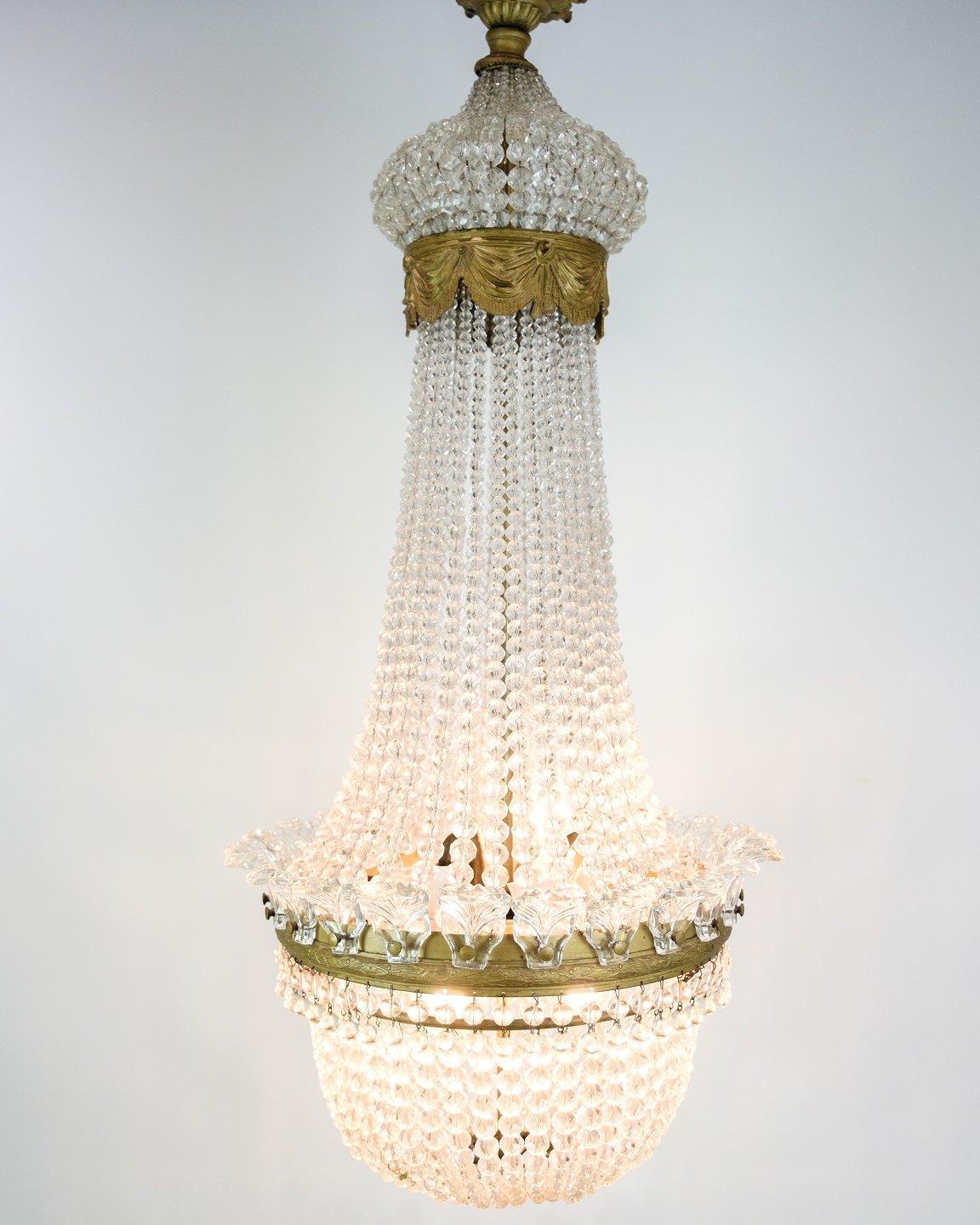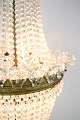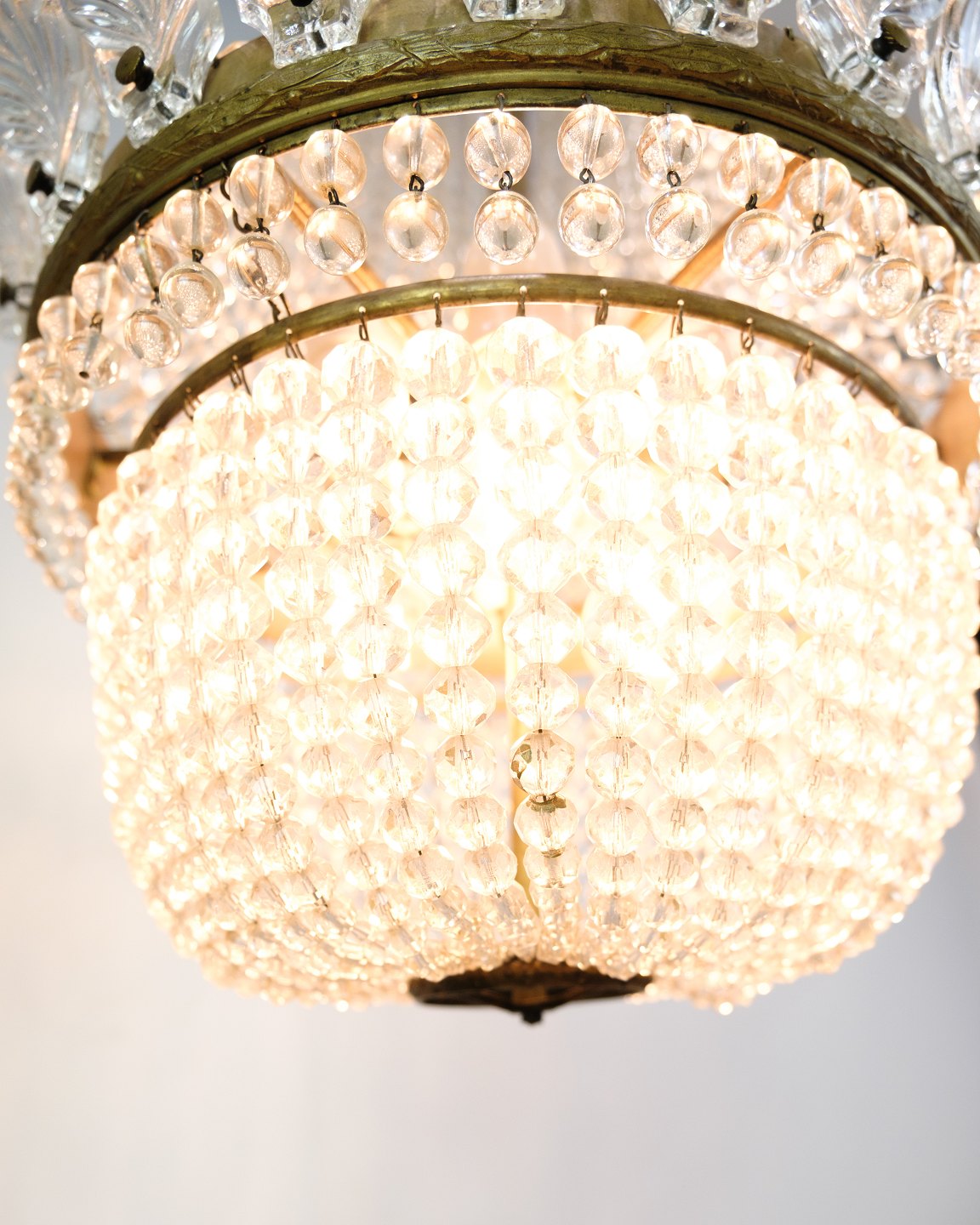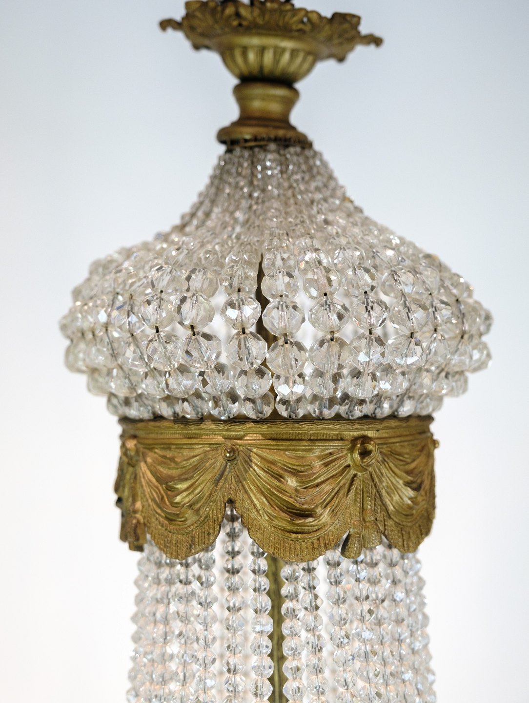 SoldAntique prism chandelier from the year 1890, made of brass and bronze, gilded and decorated with crystals. This chandelier is an example of the fine craftsmanship of the period, where precious metals and crystals create a luxurious and timeless atmosphere.