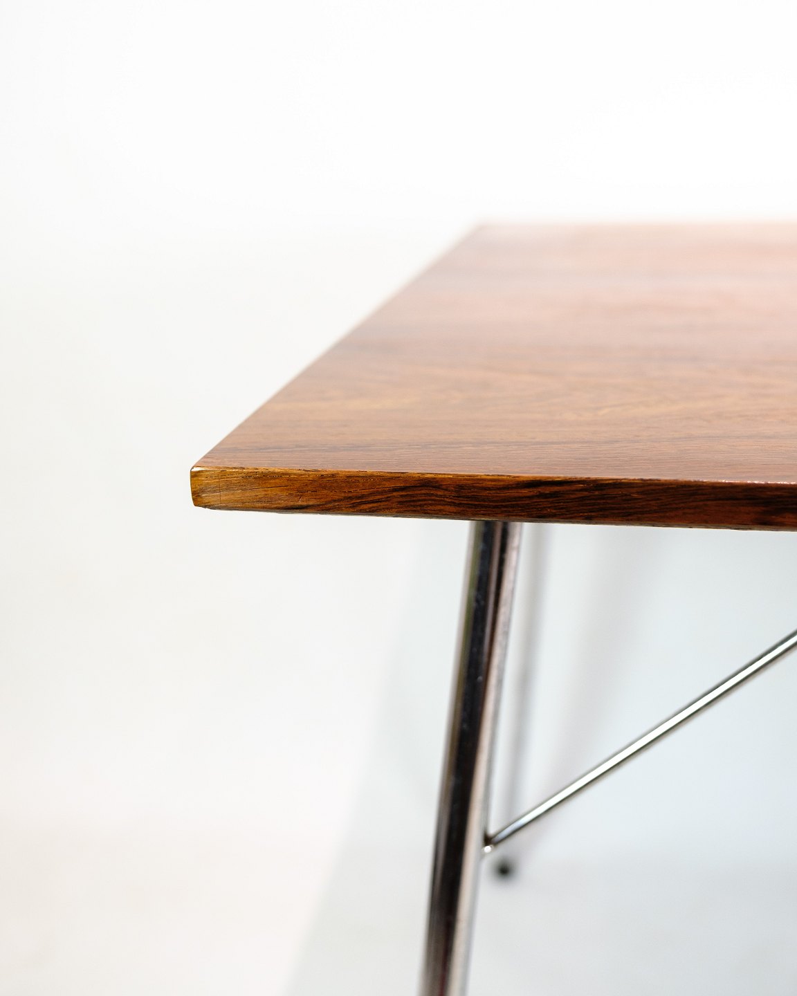 Dining table/cafe table in rosewood with chromed steel frame, designed by Arne Jacobsen for Fritz Hansen in the 1960s. The table is manufactured with a focus on both aesthetics and functionality, where the exclusive materials meet in a stylish design. Arne Jacobsen is known for his pioneering and functional designs, while Fritz Hansen is recognized for their high quality and craftsmanship.