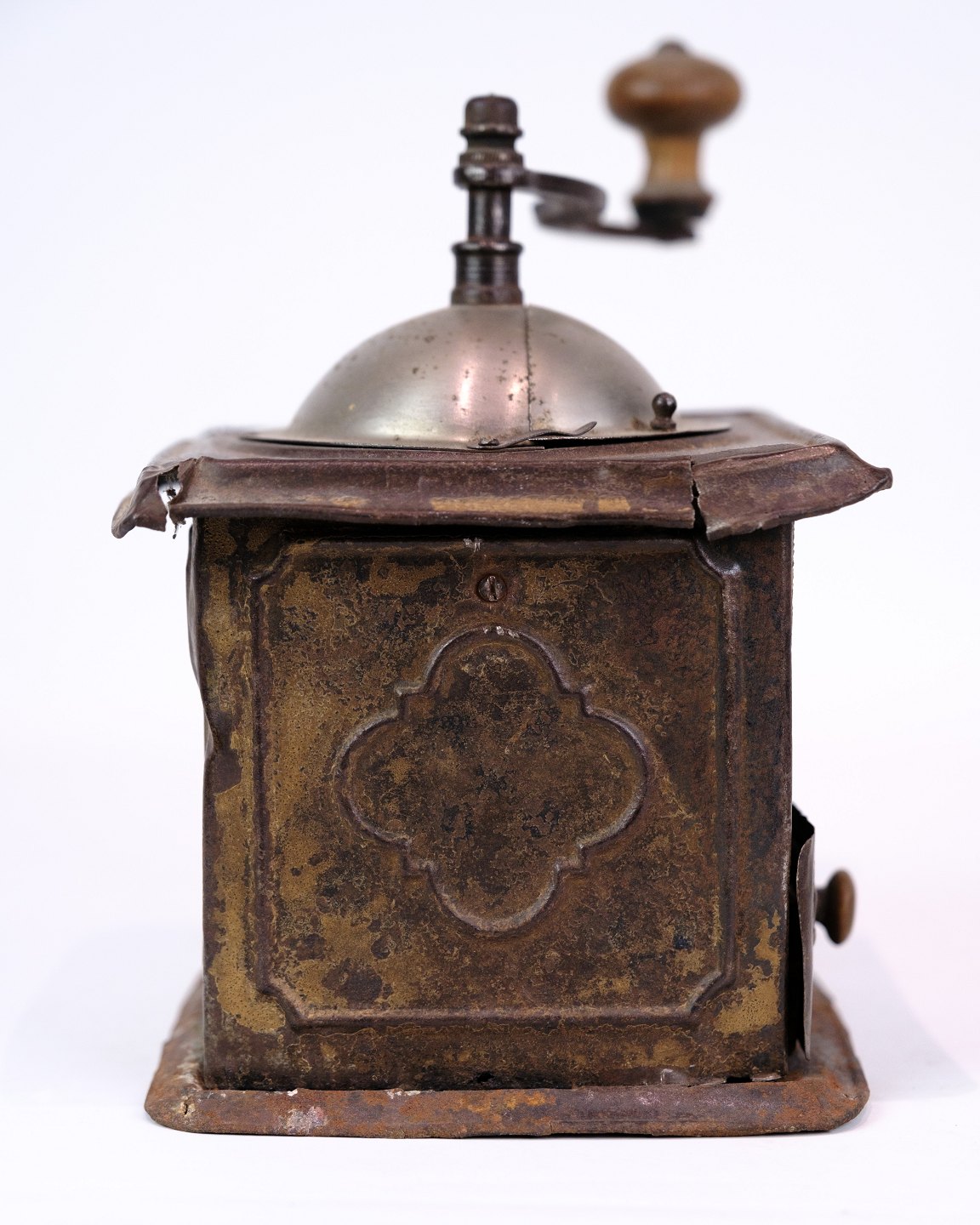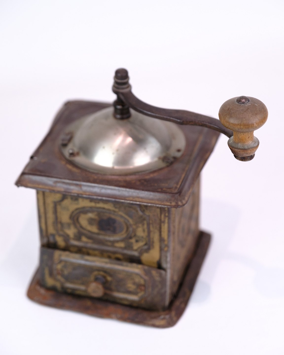 SoldAntique coffee grinder from the 1890s made of metal and dark wood, decorated with a beautiful pattern.