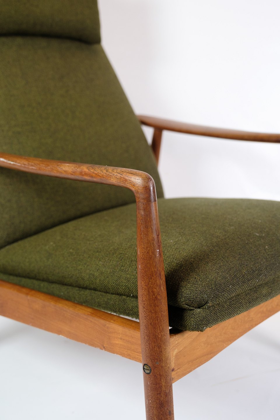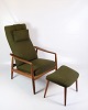 Set of 2 armchairs with ottoman in teak and green fabric, designed by Alf Svensson and produced by Fritz Hansen in the 1960s.