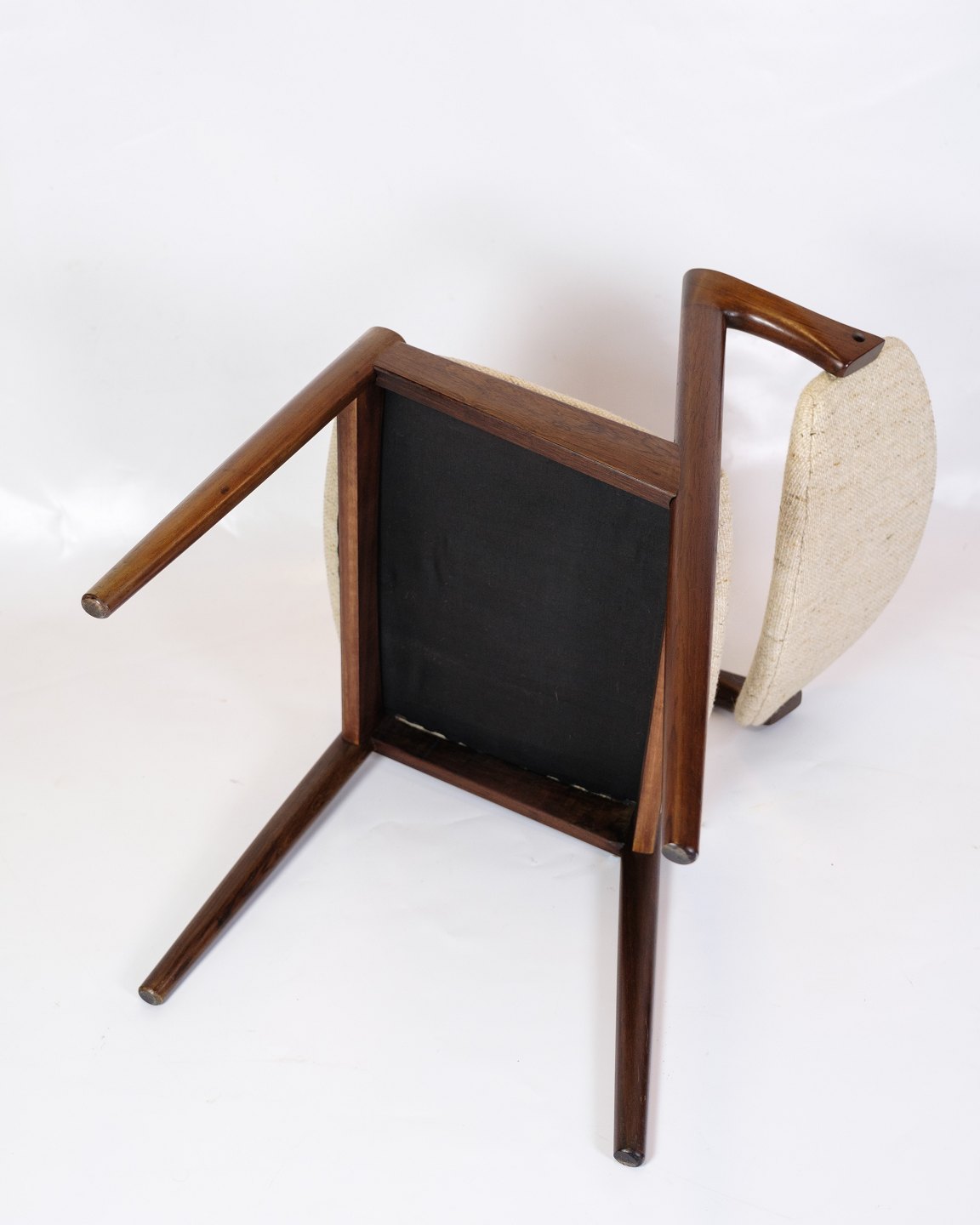 SoldSet of 6 dining table chairs, model 42, made of rosewood, designed by Kai Kristiansen and produced by Schou Andersen in the 1960s. The chairs have light fabric cushions that add comfort and a beautiful contrast to the dark tone of the rosewood. They are known for their slim, ergonomic design that combines comfort with an elegant aesthetic.