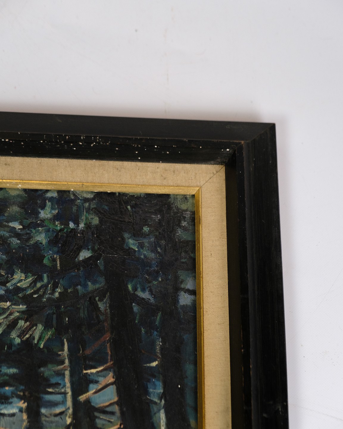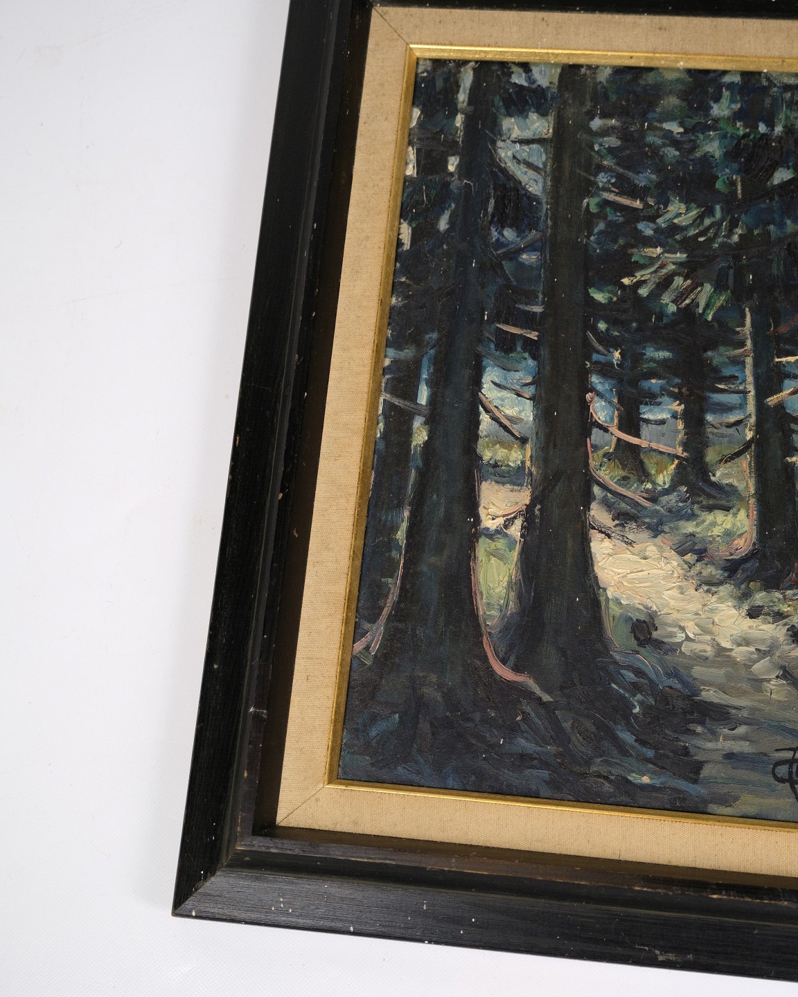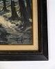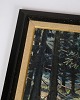 Oliemaleri indrammet i en sort og forgyldt træramme med motiv af skovlandskab signeret af John Pedersen "Bornholm"