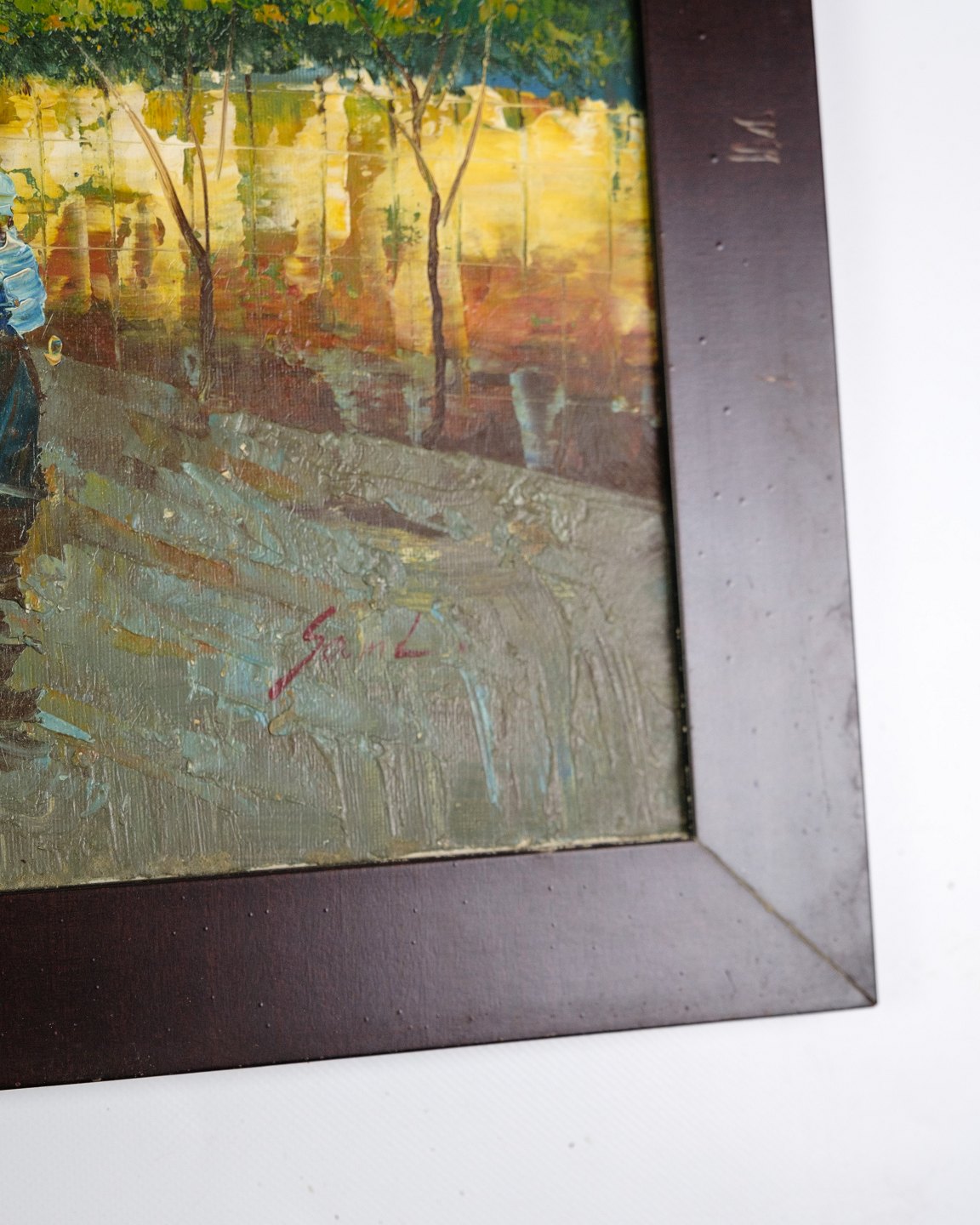 Oliemaleri med motiv af en sensommeraften i Paris, hvor Eiffeltårnet kan ses i baggrunden.