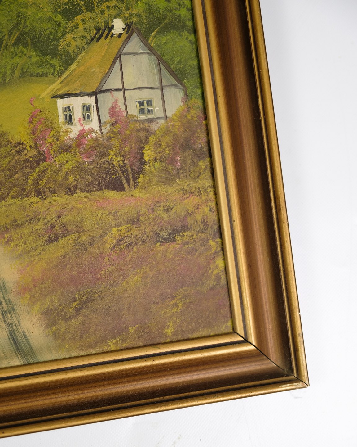 Painting on canvas with the motif of a farmhouse located in a forest, with the forest and the water as a background to the picture. A small road leads down to the house and creates an atmospheric connection between nature and home. The painting captures a peaceful atmosphere with the calm elements of nature.