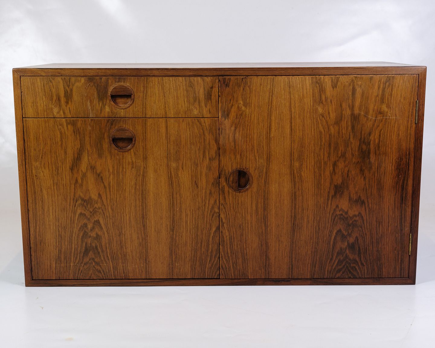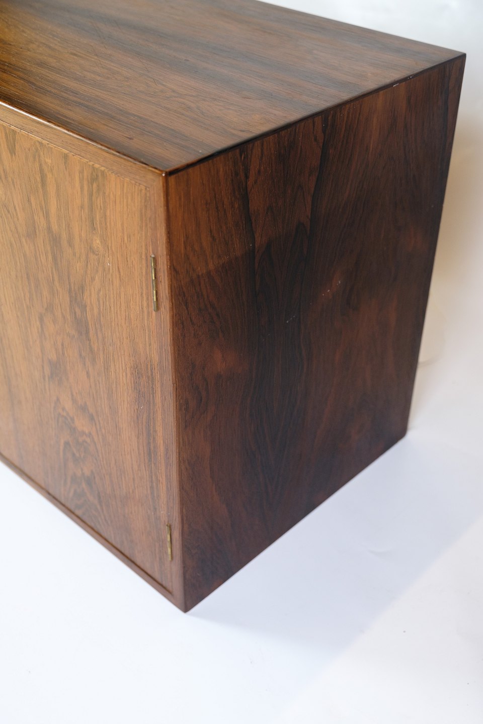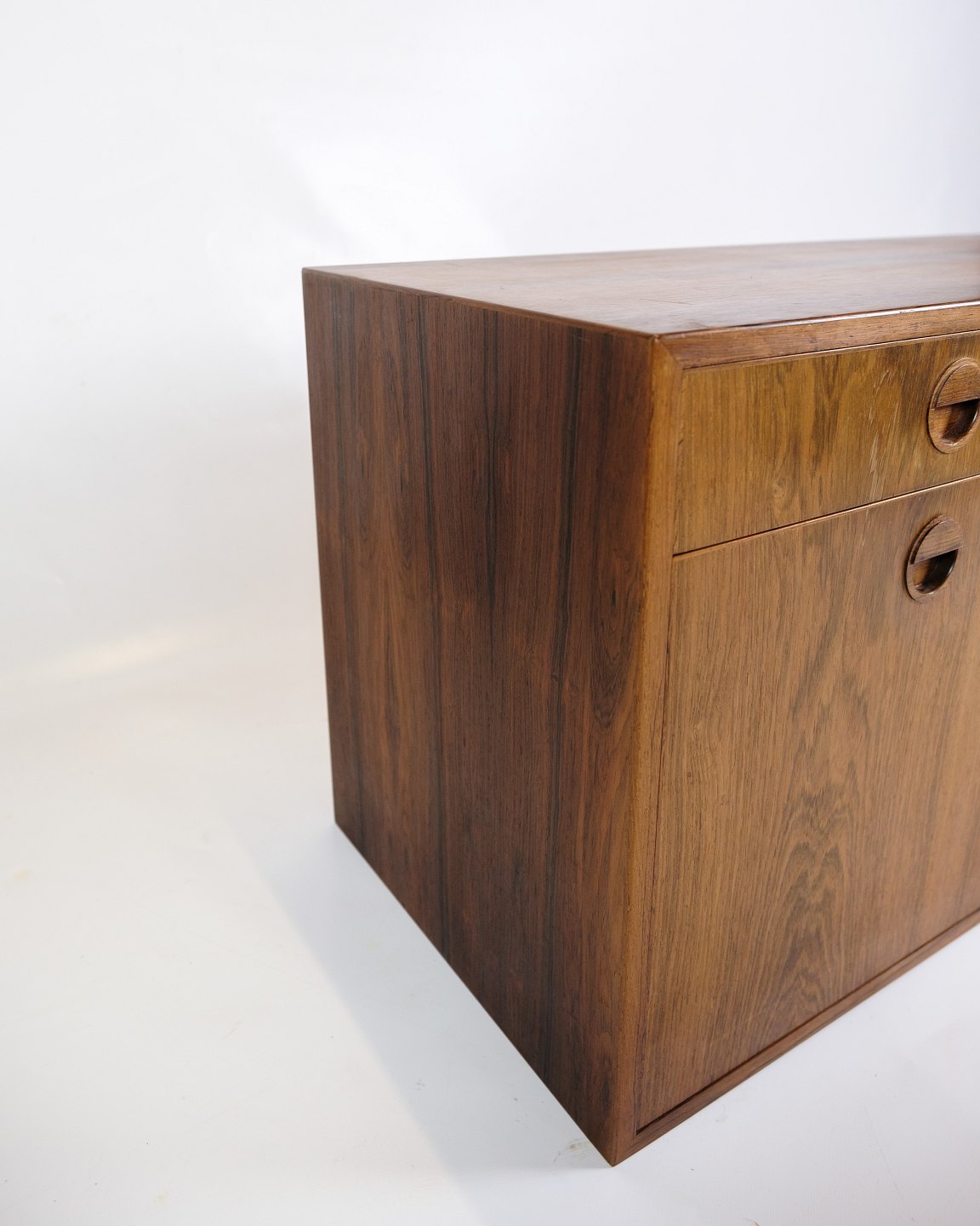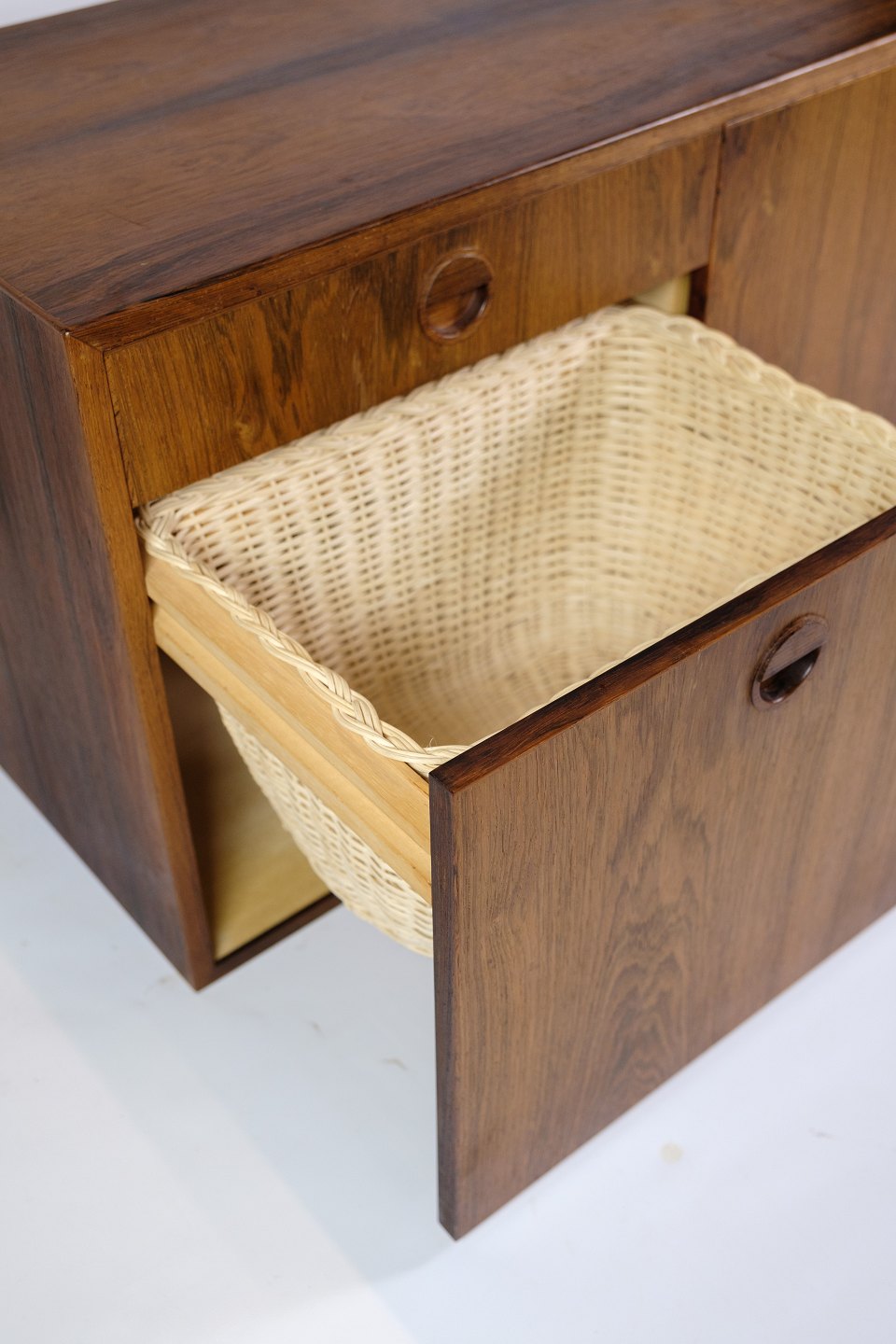 Væghængt kommode/skab i palisander fra 1960'erne, af dansk design. Kommoden har en pladsbesparende konstruktion og er lavet af palisandertræ, der giver den et elegant udseende.