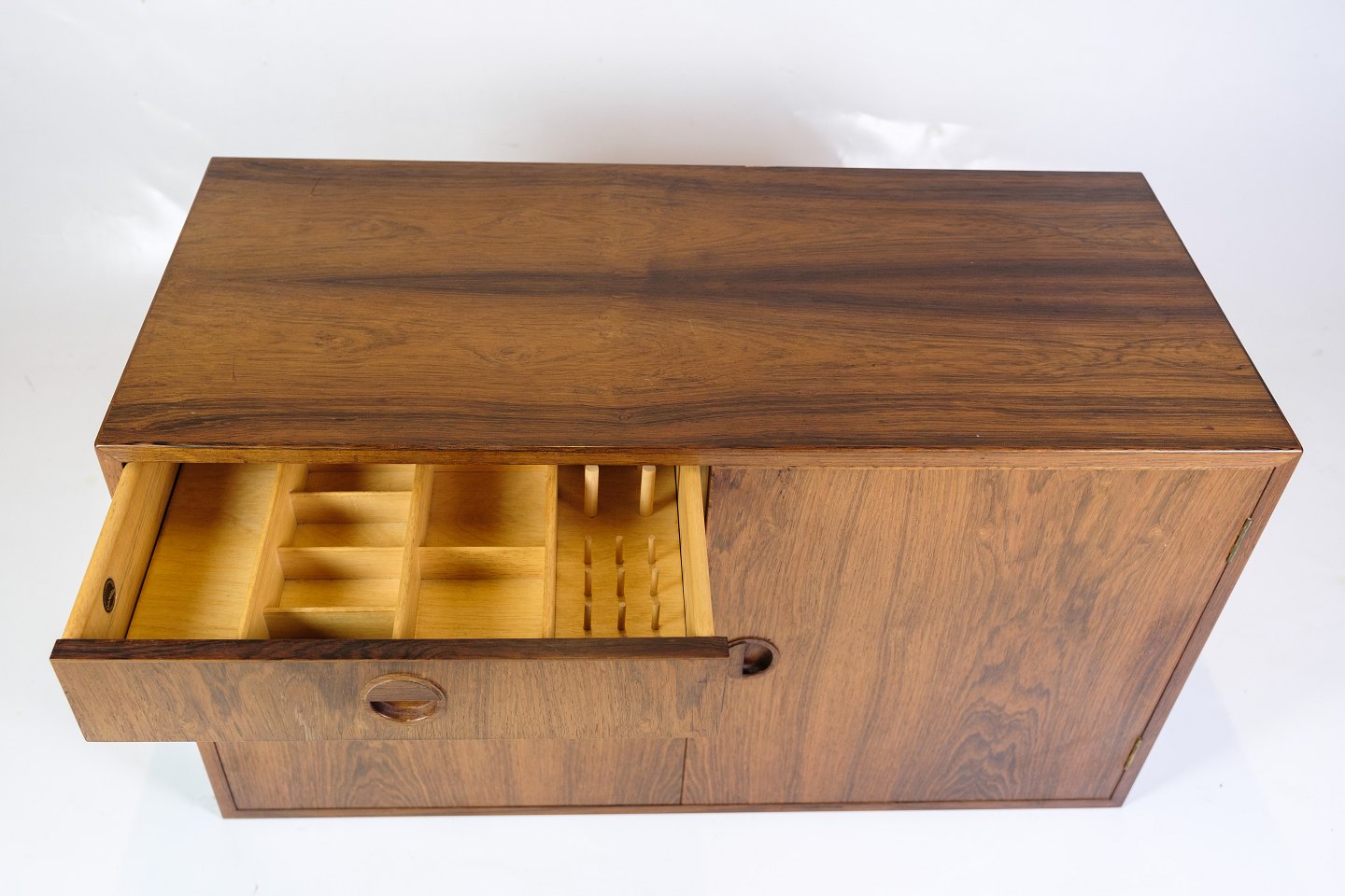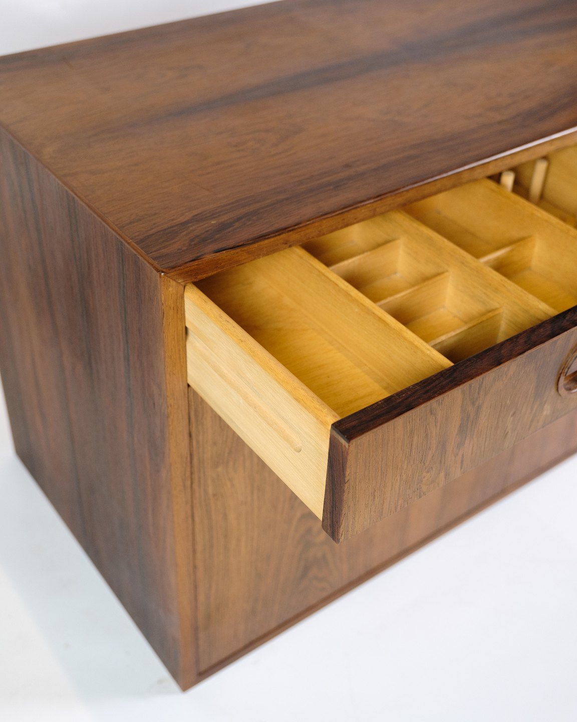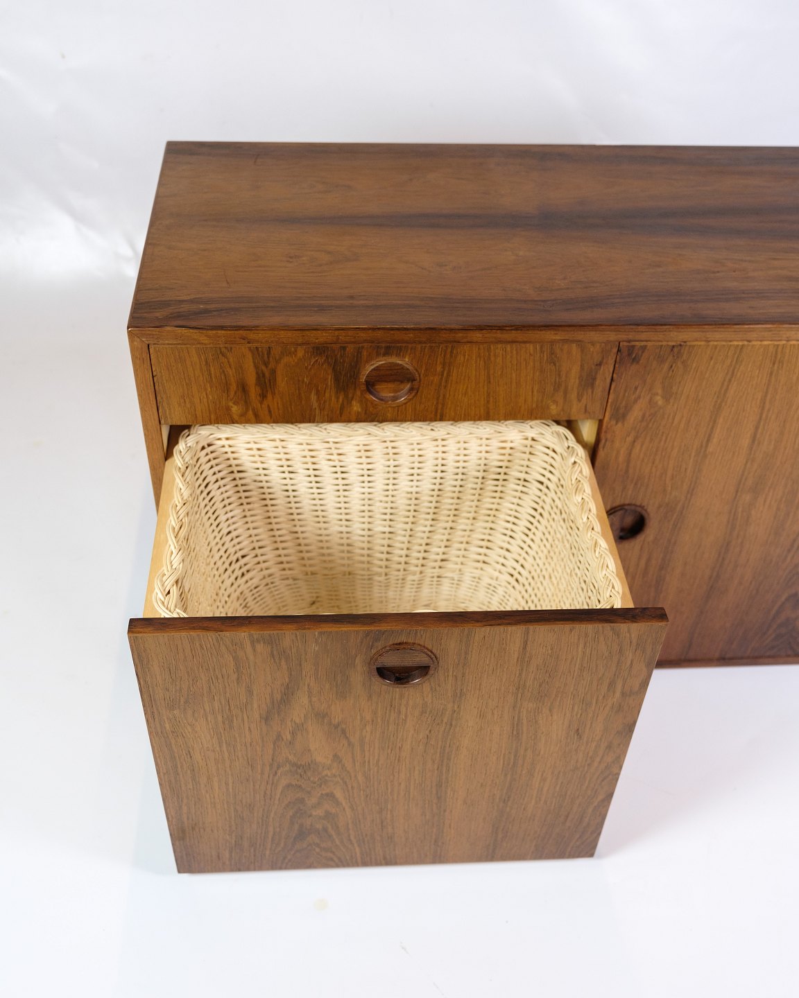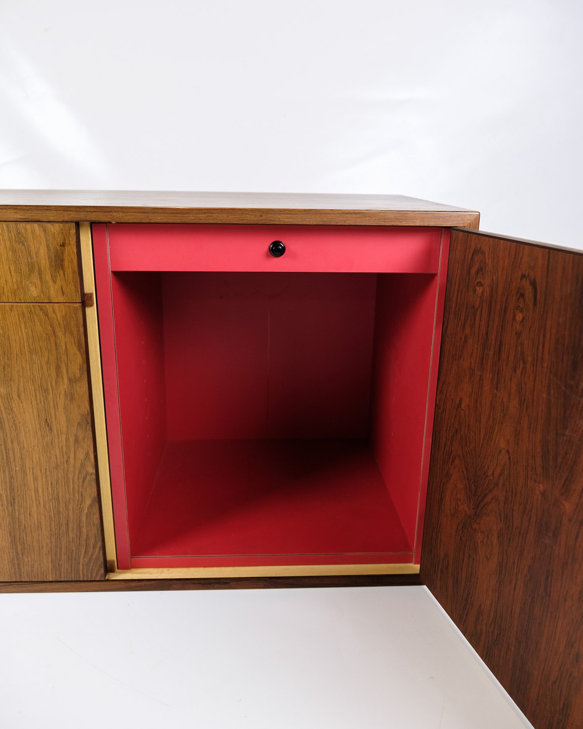 Væghængt kommode/skab i palisander fra 1960'erne, af dansk design. Kommoden har en pladsbesparende konstruktion og er lavet af palisandertræ, der giver den et elegant udseende.