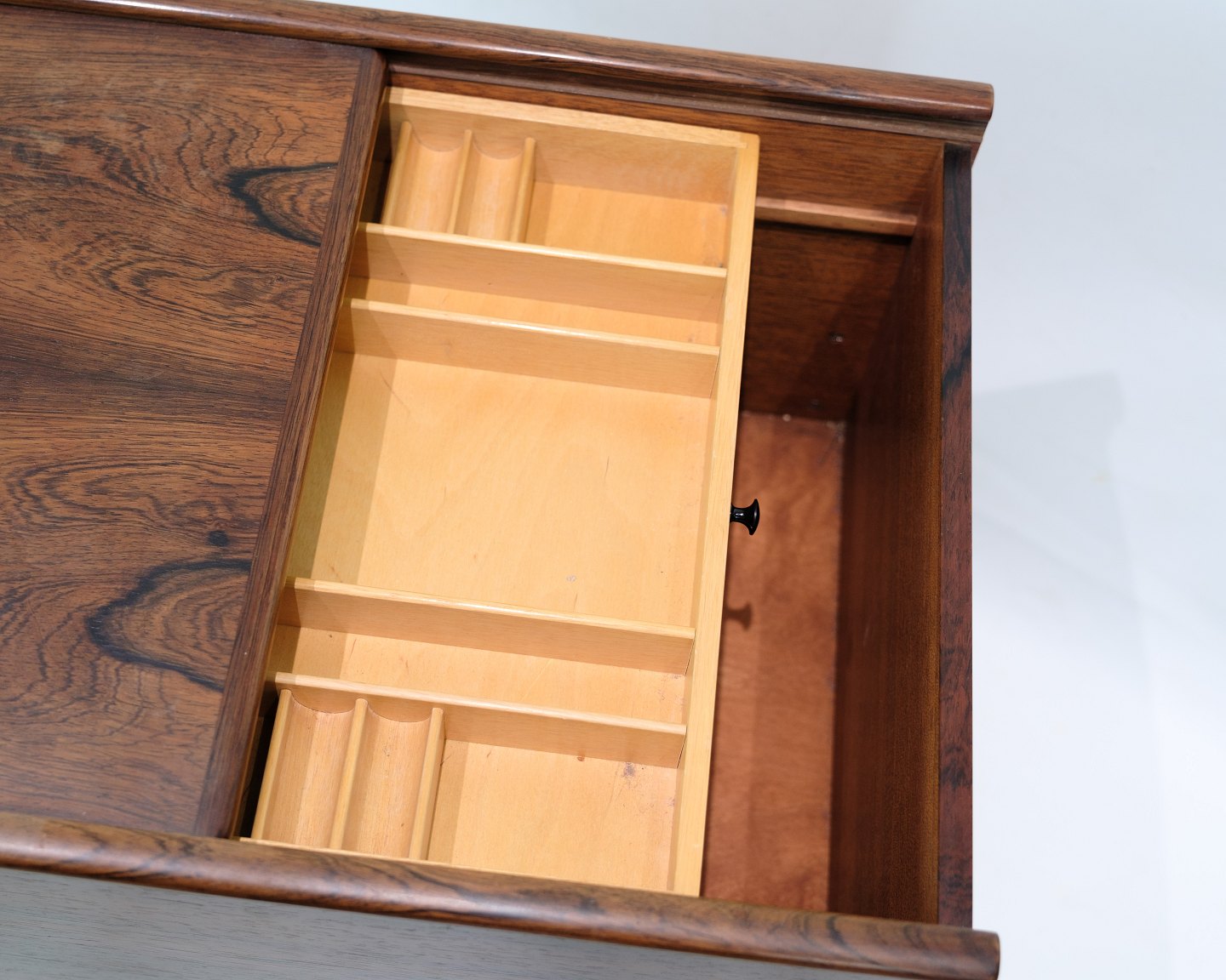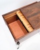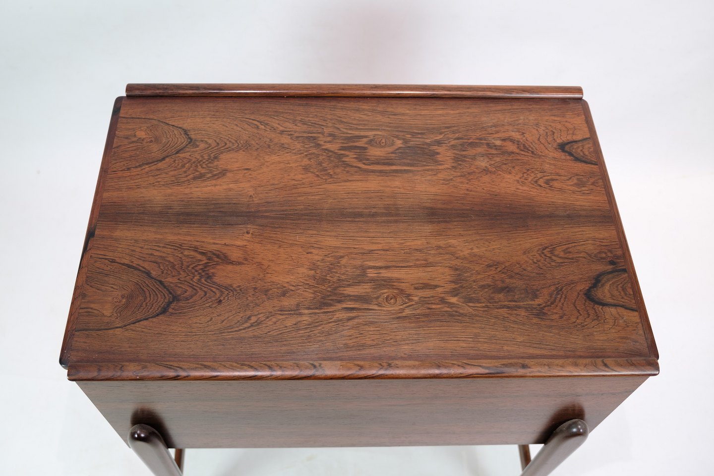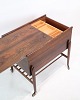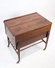 Sybord med hjul i palisander fra 1960'erne. Bordet har en praktisk indbygget skuffe til opbevaring af sytilbehør og er fremstillet af materialer, der sikrer god holdbarhed. Hjulene gør bordet let at flytte rundt, hvilket øger dets funktionalitet. Palisandertræet er kendt for sin slidstyrke, hvilket gør bordet til et solidt valg for langvarig brug.