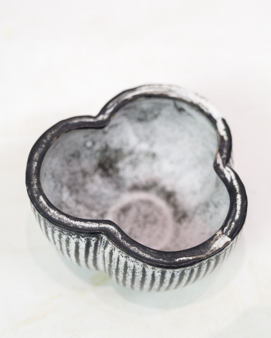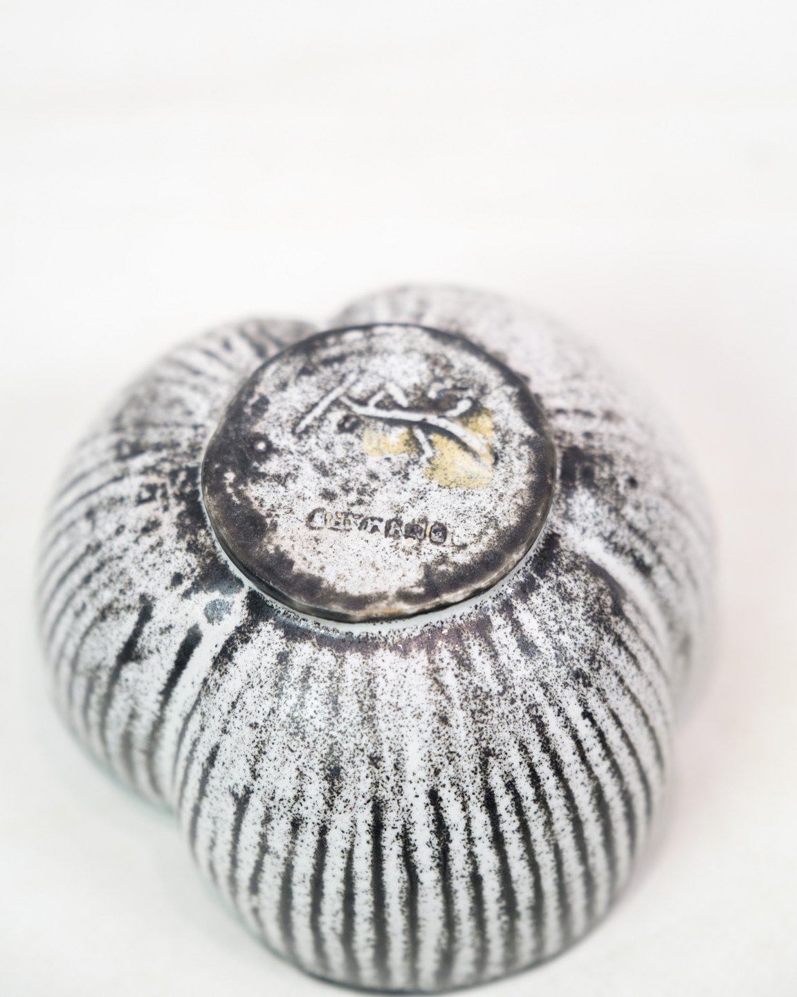 SolgtSkål med grå/sort dobbeltglasur, designet af Svend Hammershøj og fremstillet af Kähler i 1940'erne. Hammershøj var en kendt dansk keramiker, der arbejdede med Kähler fra starten af 1900-tallet og var kendt for sine eksperimenter med forskellige glasurer, herunder den dobbeltglasur, som blev et kendetegn i hans designs.