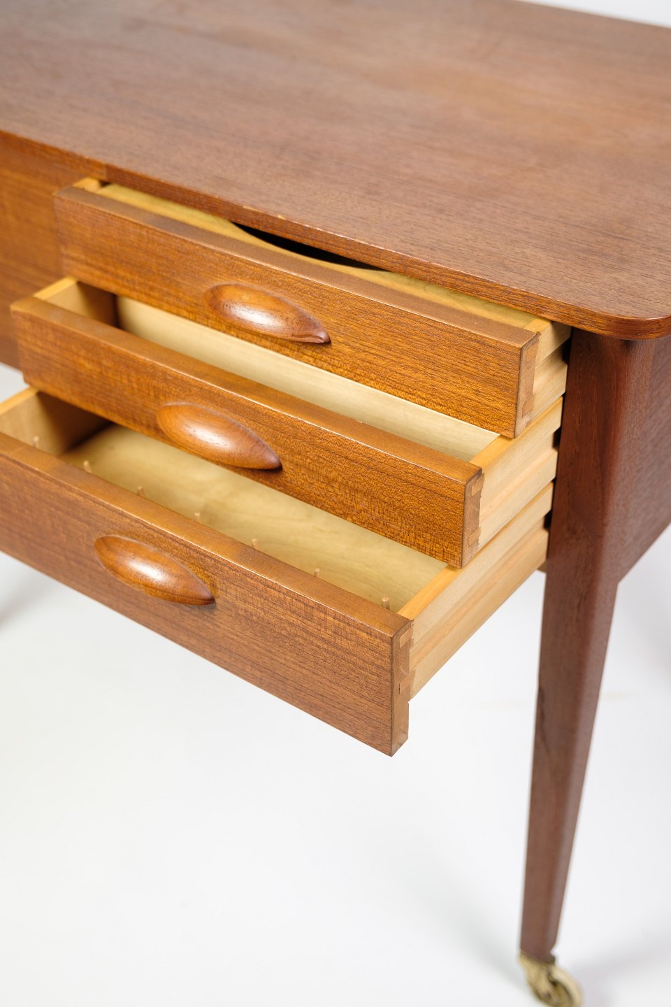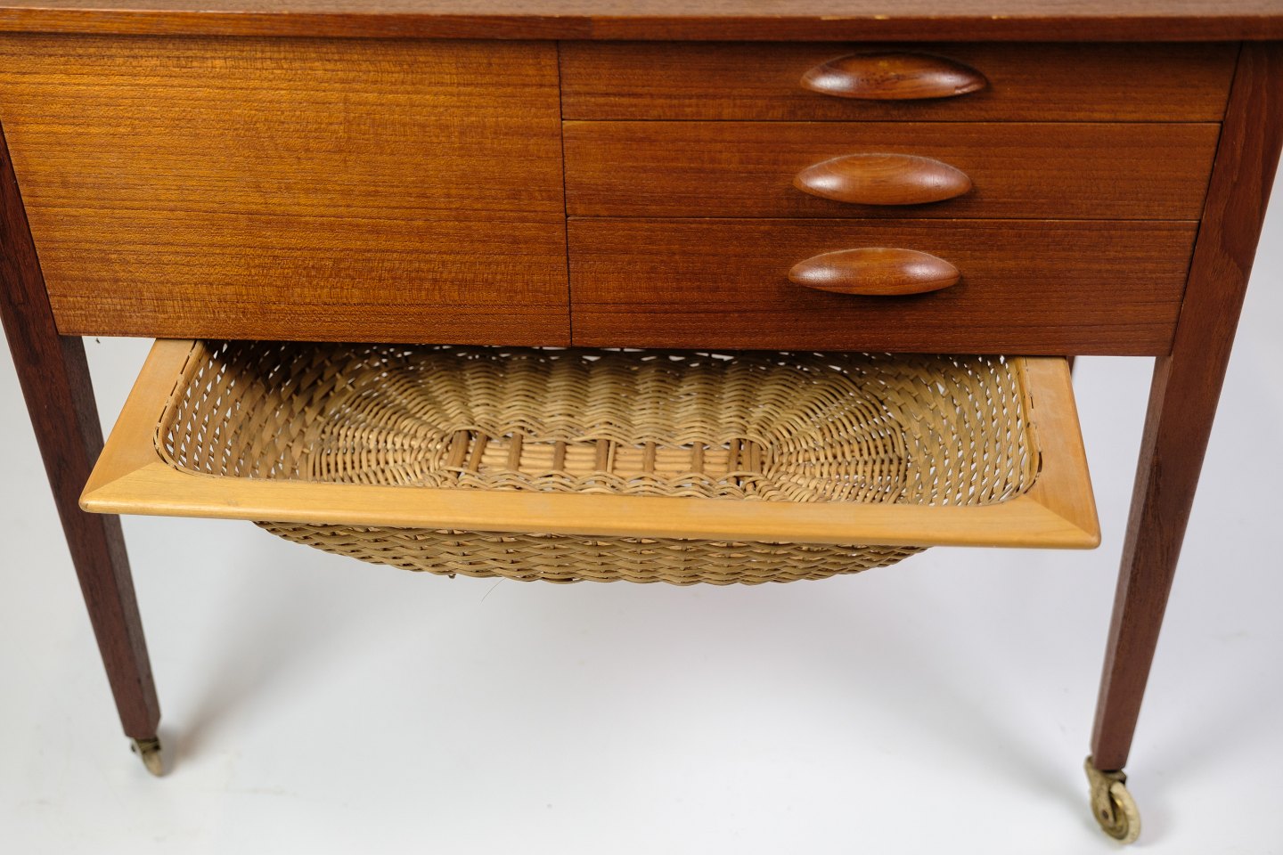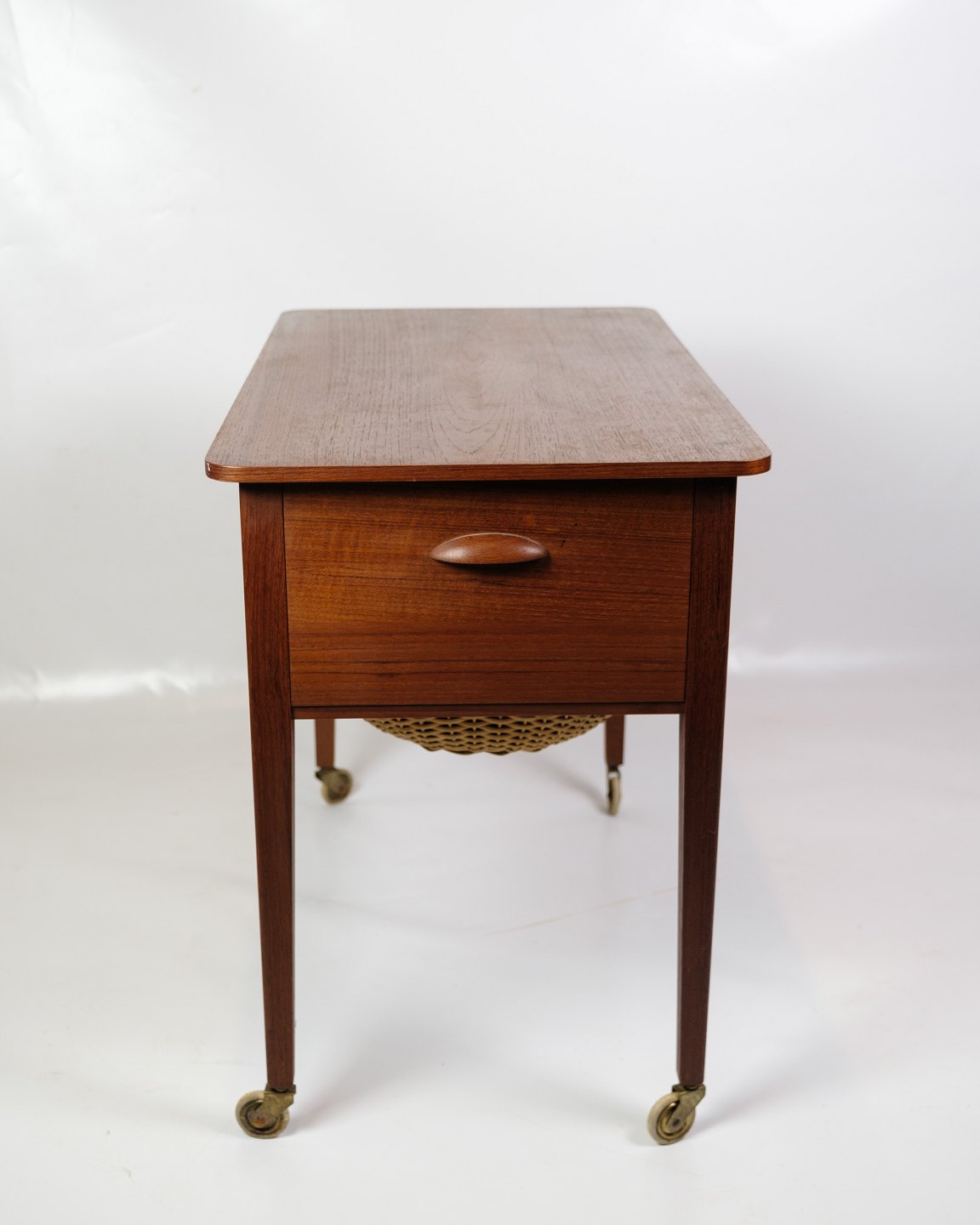 Sybord med hjul i teak fra 1960'erne. Bordet er udstyret med praktiske skuffer til opbevaring af sytilbehør og andre småting. Hjulene gør det nemt at flytte rundt, hvilket øger bordets funktionalitet i hjemmet. Teaktræet giver bordet en varm og naturlig glød, som er typisk for dansk møbeldesign fra denne periode.