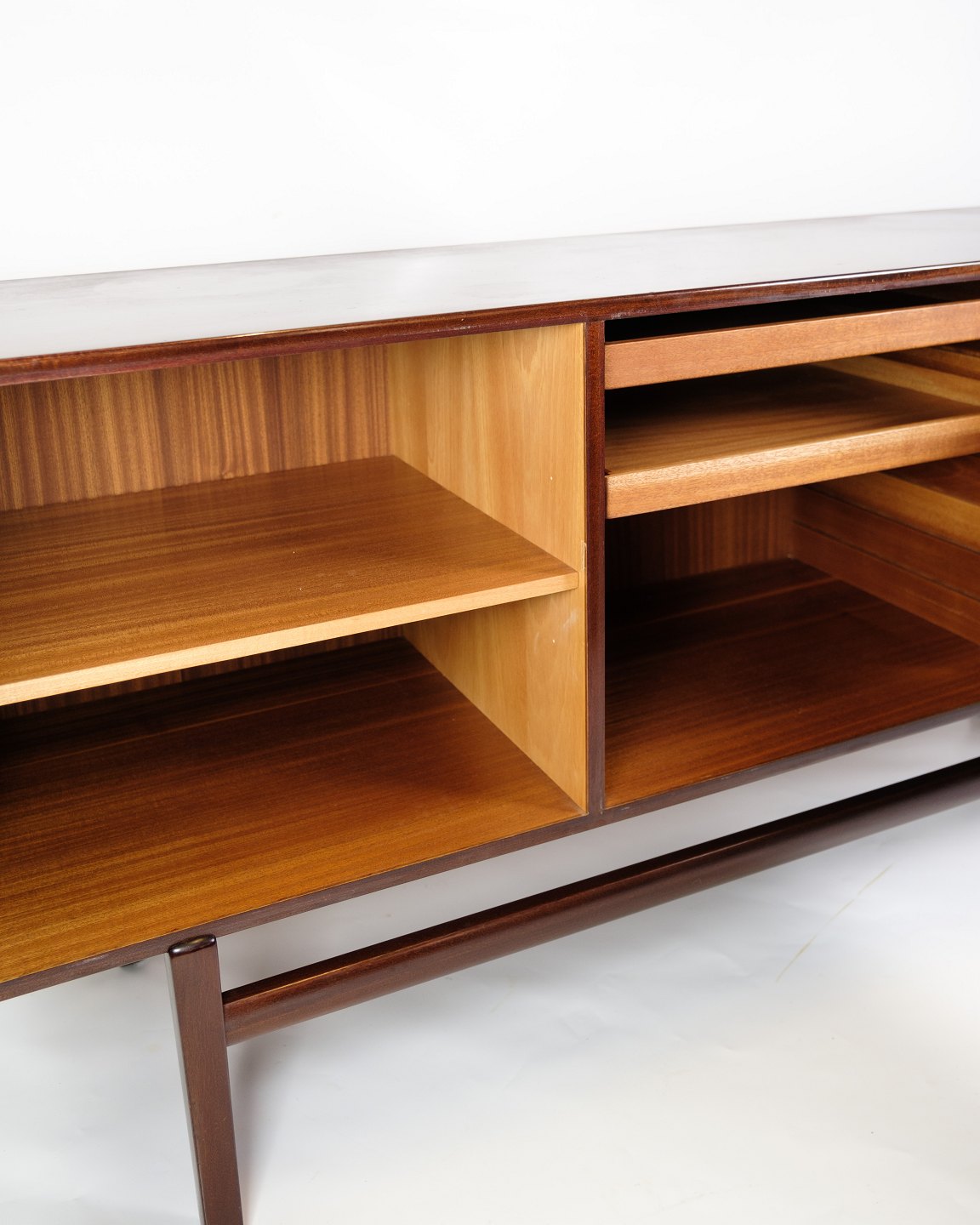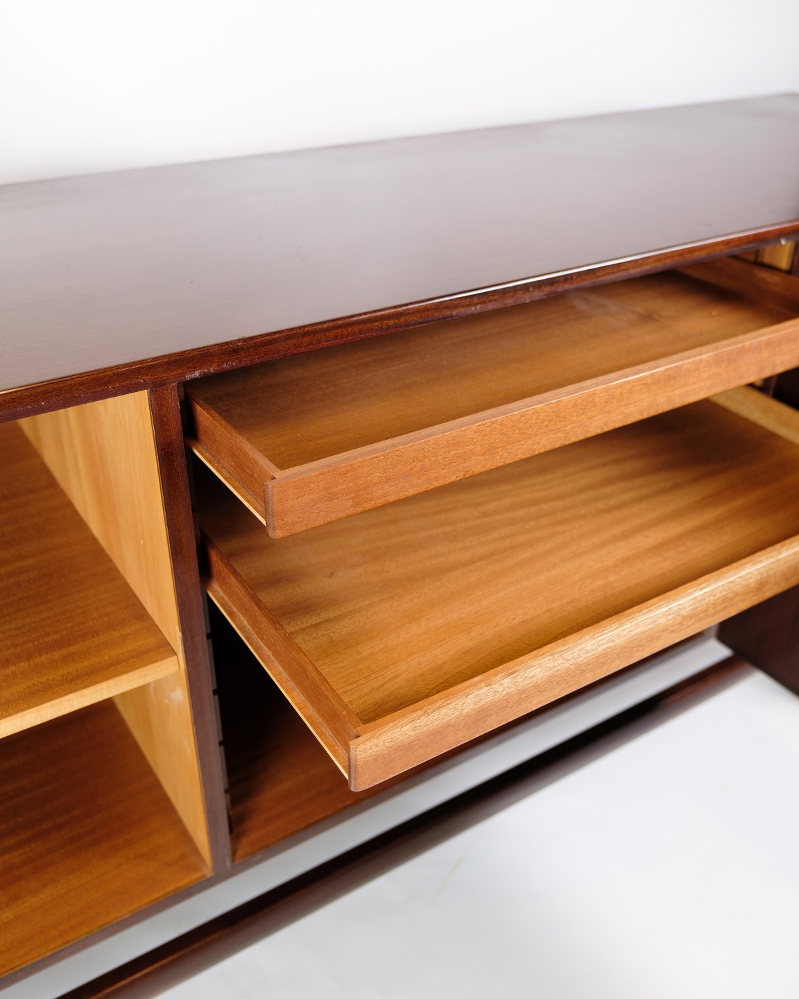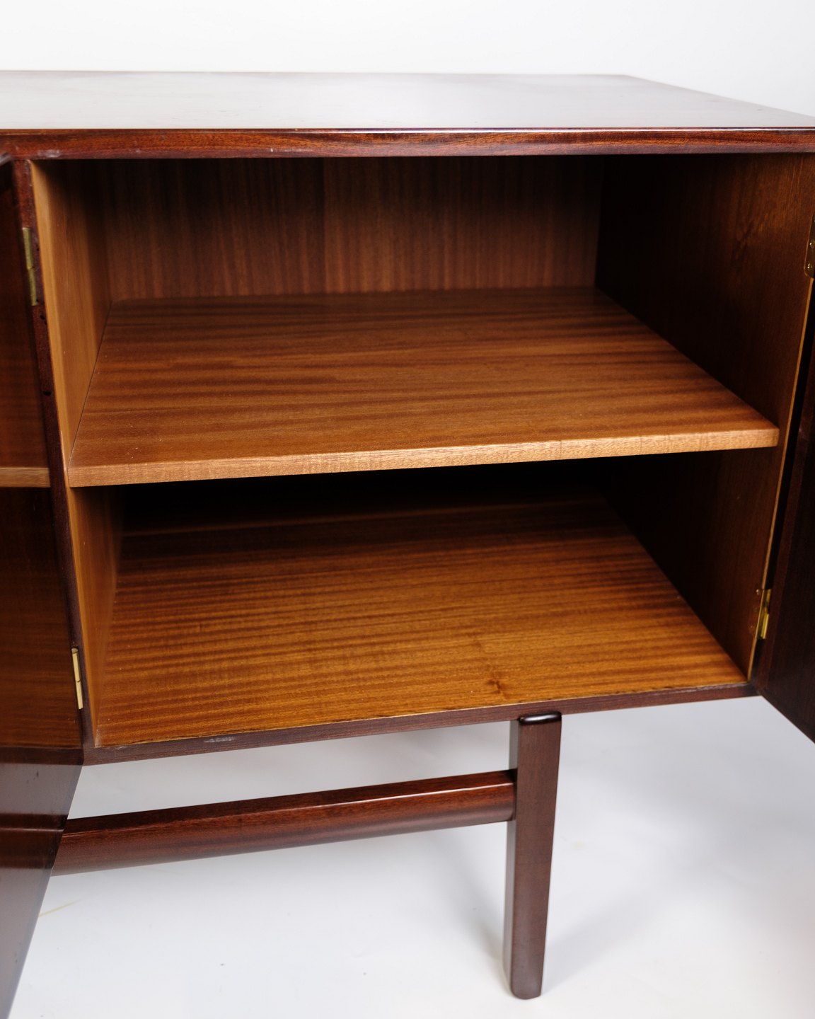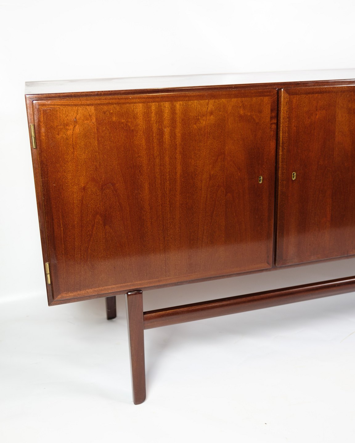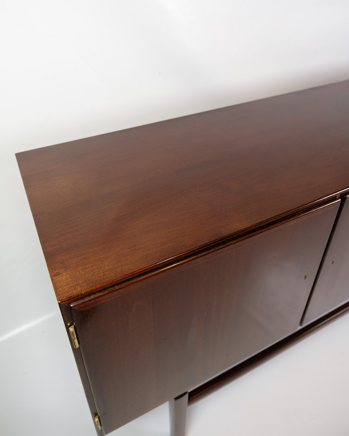 SoldMahogany sideboard, designed by Ole Wanscher and manufactured by P. Jeppesen in the 1960s. The sideboard has three doors on the front, which open up to spacious storage compartments with shelves on both sides and two drawers in the middle, ideal for storing smaller items. The mortise joints and the beautiful mahogany highlight the quality and solid craftsmanship that are characteristic of Wanscher's designs.