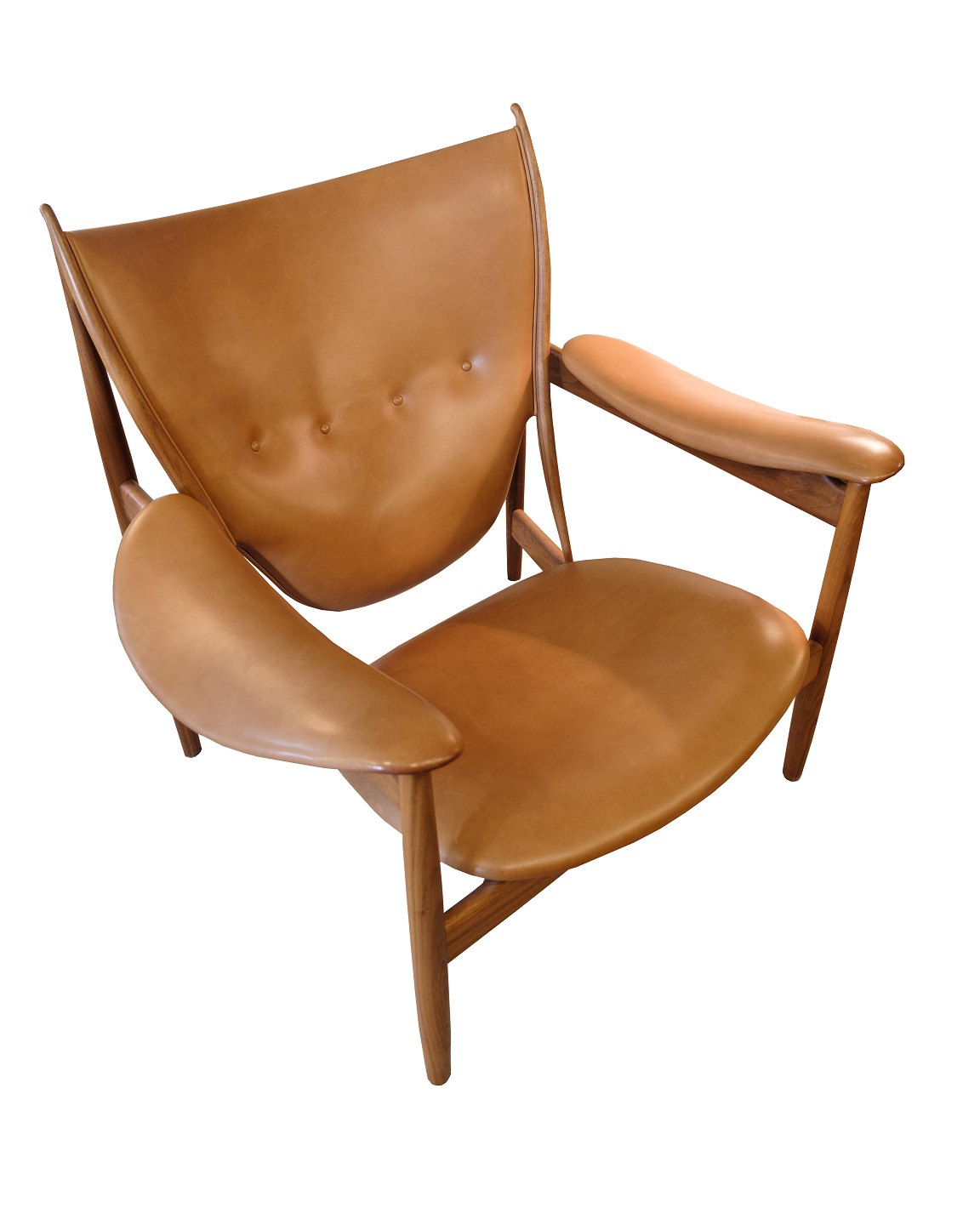 SoldDesigned by Finn Juhl in 1949, he invented the chief's chair as we know it today. Produced in walnut wood with cognac leather of the highest quality. The chair has an accompanying stool, which fits the chair in both wood and leather. The chair is made like a sculpture, due to the large size and beautiful details, which is also the reason for the English name "Chieftains Chair".
