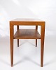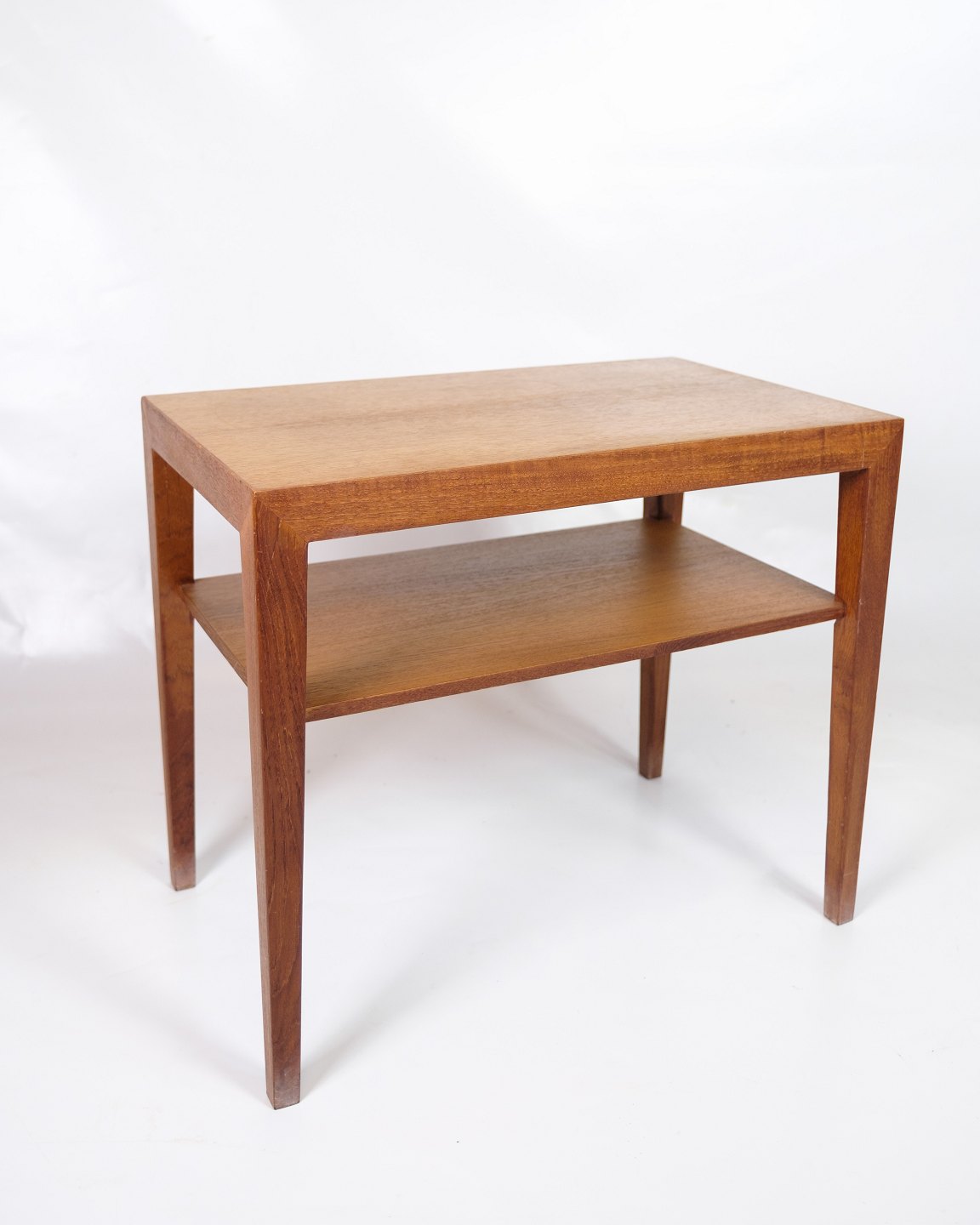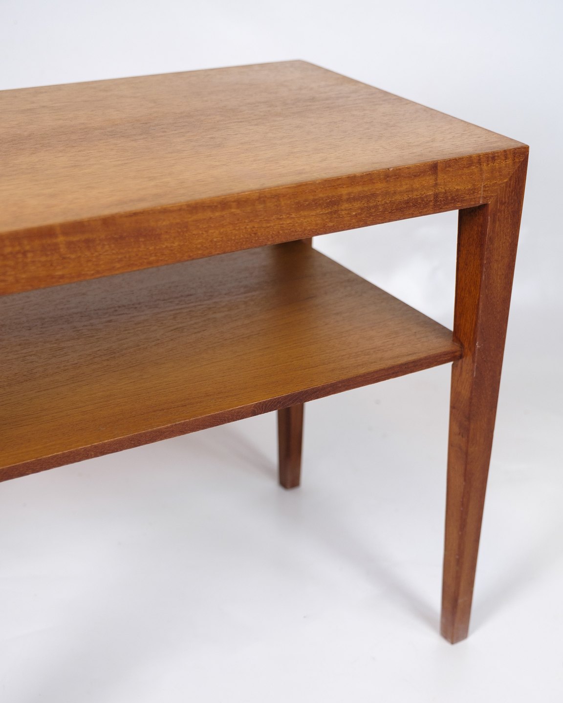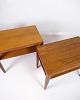 SoldSet of 2 teak side tables with shelf, designed by Severin Hansen and produced by Haslev Møbelfabrik in the 1960s. The tables have the characteristic and precise joinery that Hansen is known for, including the beautiful, slanted leg joints that elegantly meet the table top. The extra shelf provides practical storage space and makes the tables usable both as side tables and small coffee tables.