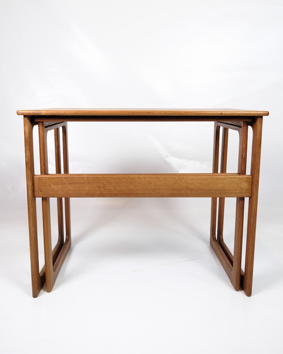 Sæt af 2 indskudsborde, model 219, udført i teak og designet af Johannes Andersen & Illum Wikkelsø, fremstillet af CFC Silkeborg i 1960'erne. Bordene er kendetegnet ved deres enkle og funktionelle design med smukke detaljer, såsom de let afrundede kanter og slanke ben, som er typiske for dansk møbelkunst fra perioden.