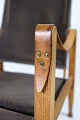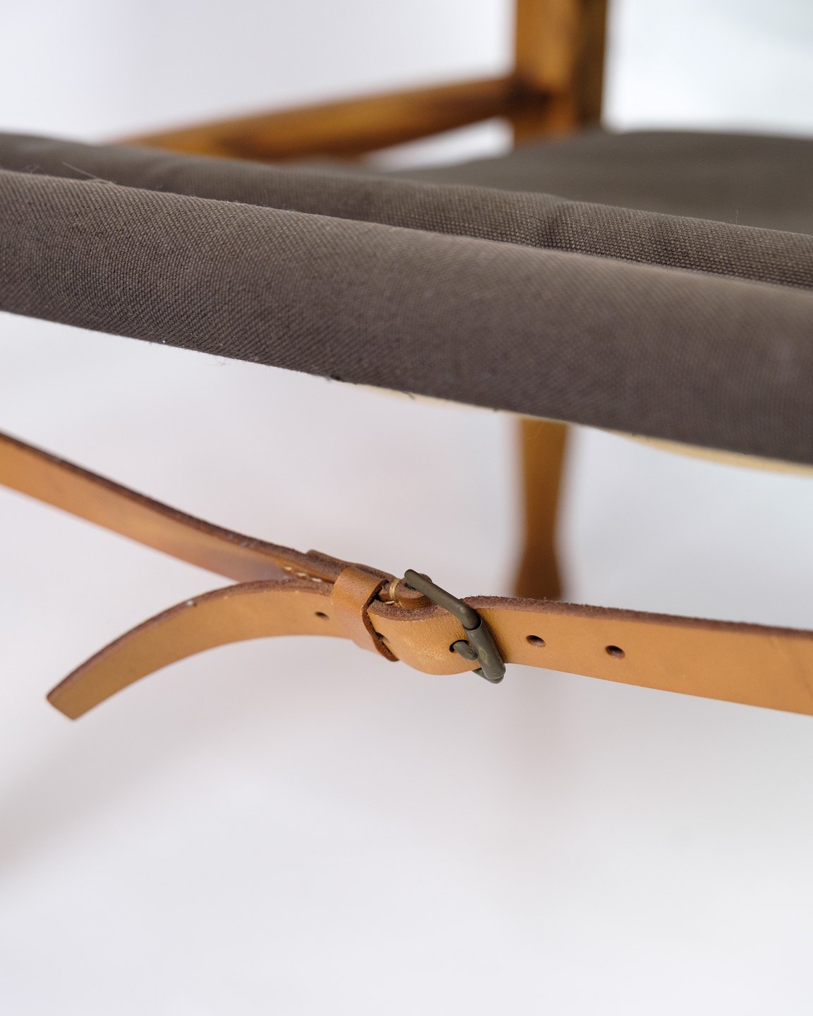 Et sæt safari-lænestole designet af Kaare Klint og fremstillet af Rud. Rasmussen. Stolene er udført i asketræ med sæde og ryg i brunt kanvas samt armlæn i kernelæder. Safari-stolene er kendt for deres enkle og funktionelle design, hvor fleksible materialer og aftagelige elementer gør dem både lette og praktiske.