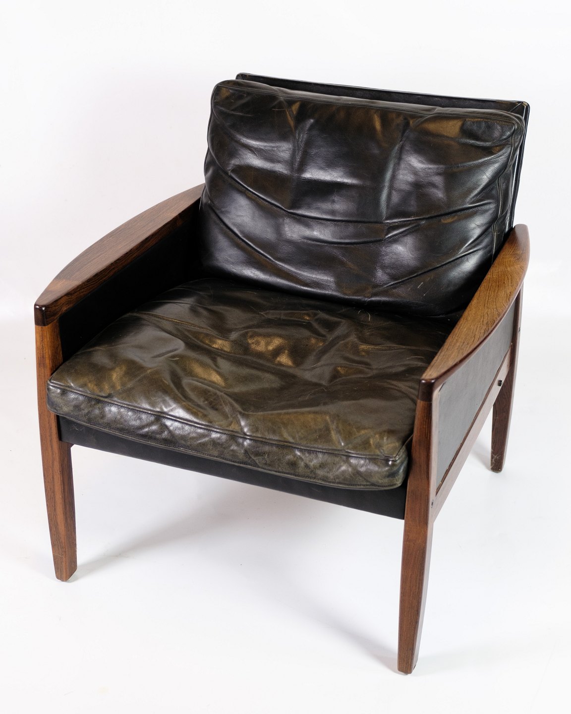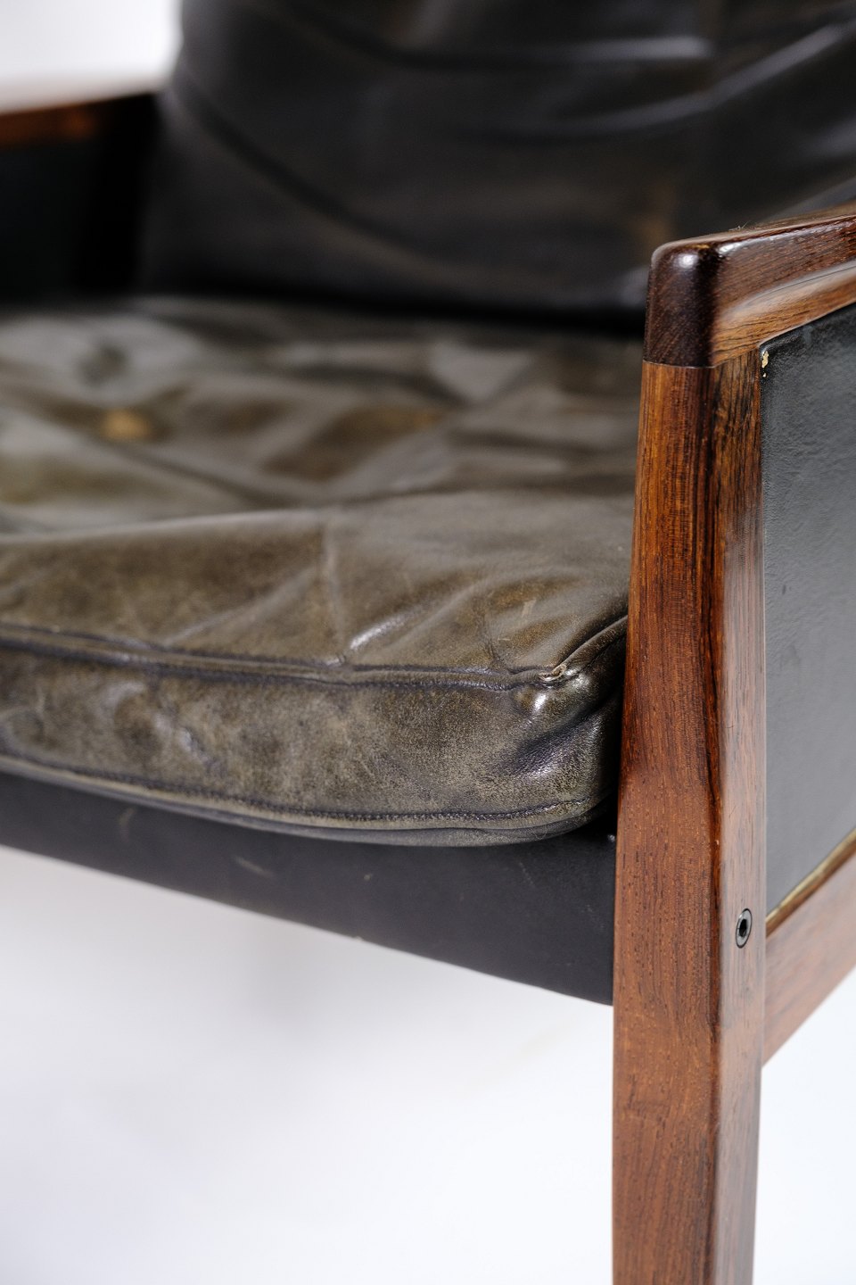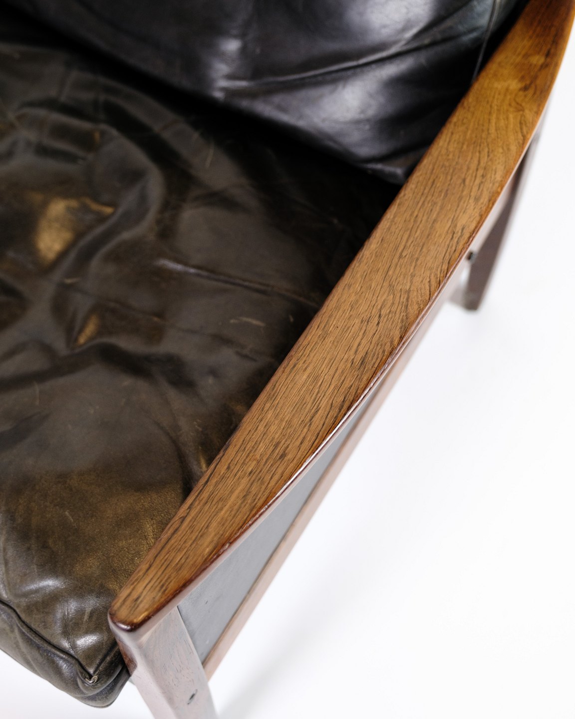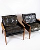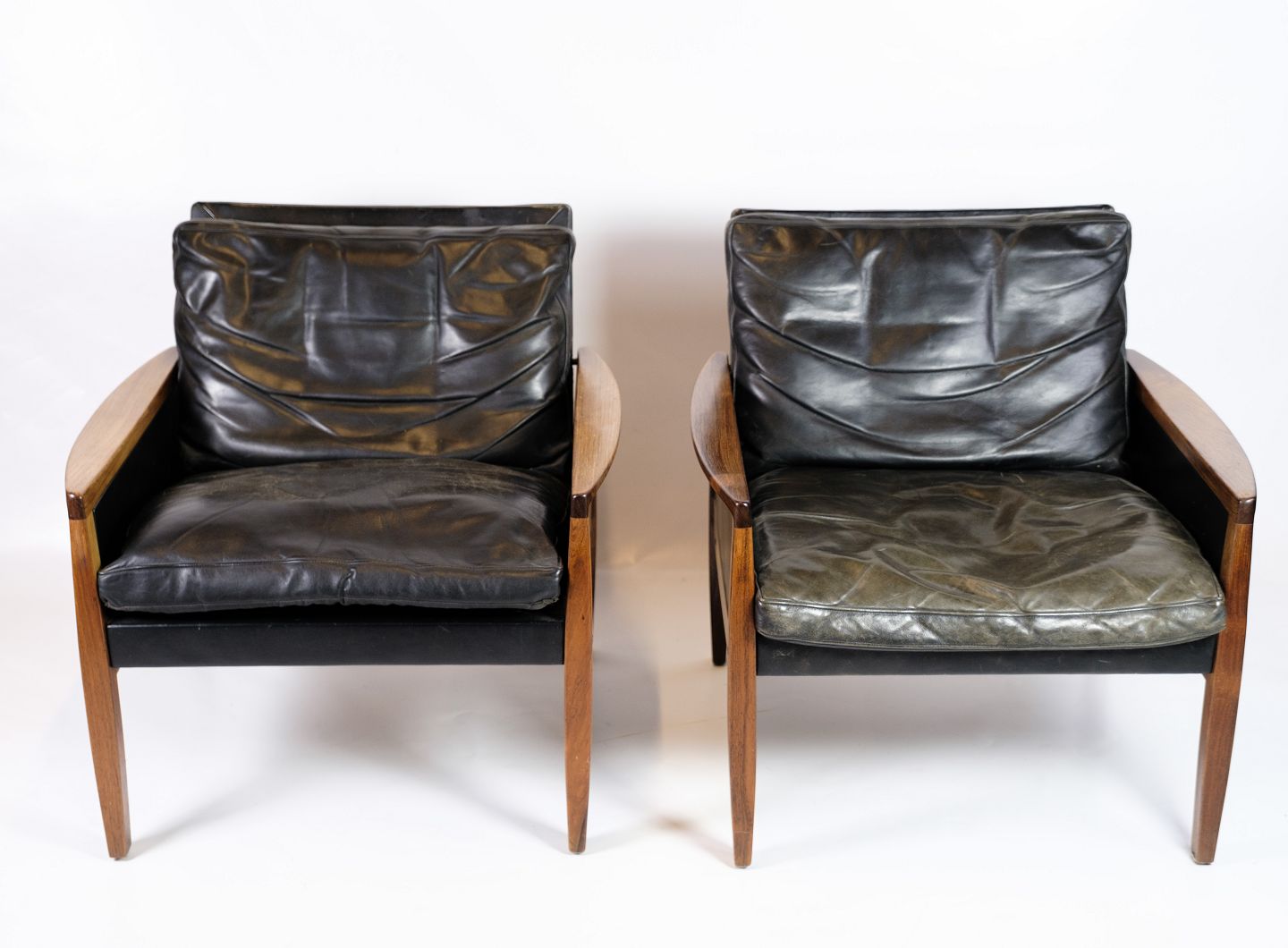 Sæt Af 2 Lænestol - Palisander - Sorte Læder Hynder - Hans Olsen - Brdr. Juul Kristensen - 1960erne