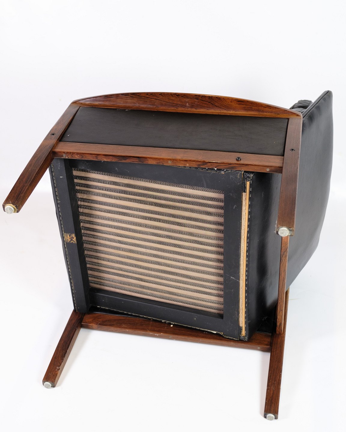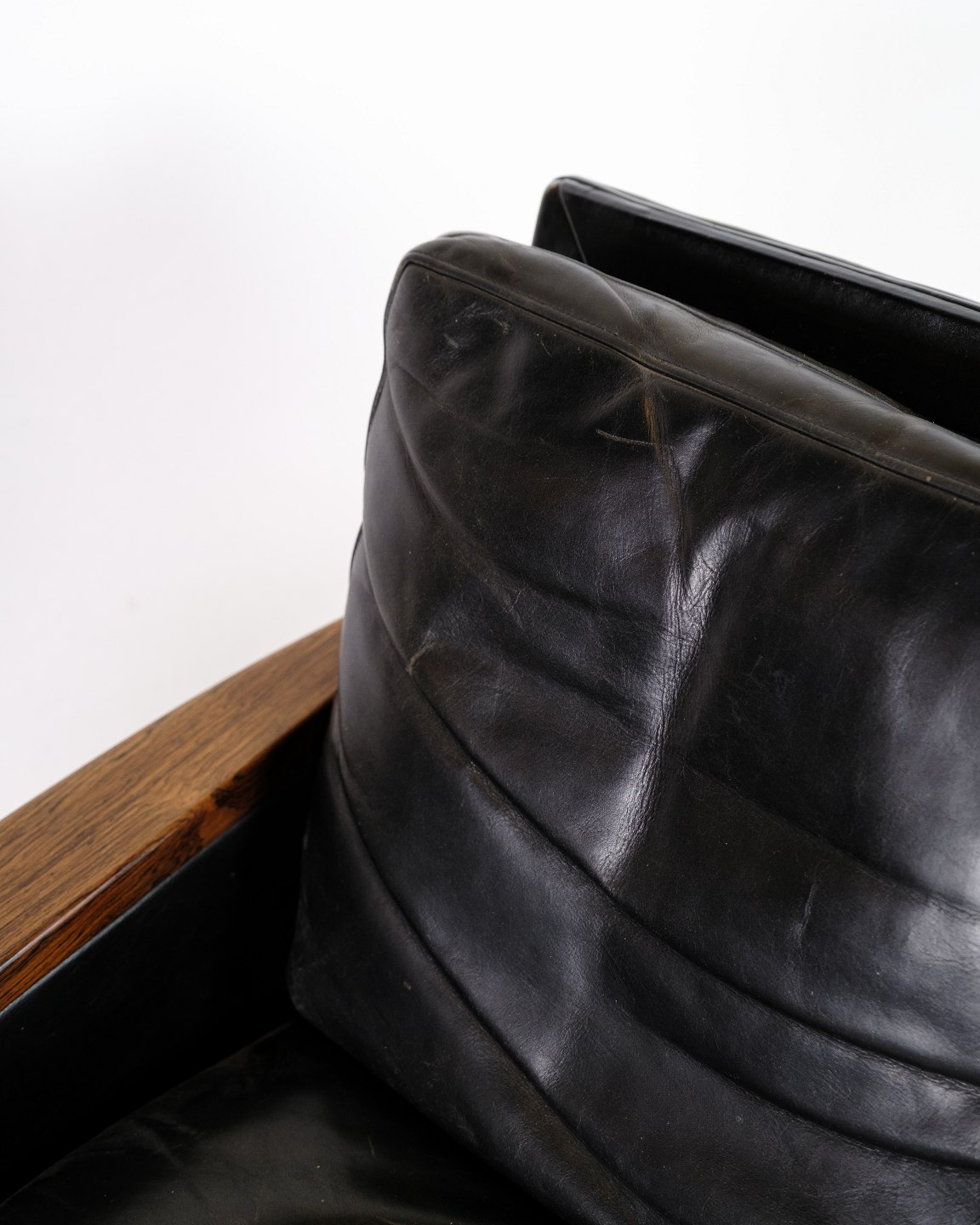 Dette sæt af 2 lænestole i palisander med sorte læderhynder er et pragteksempel på klassisk dansk design. Palisandertræet, med sin dybe farve og fine korn, giver stolen en unik og luksuriøs udstråling, mens det bløde, sorte læder sikrer en behagelig siddeoplevelse.