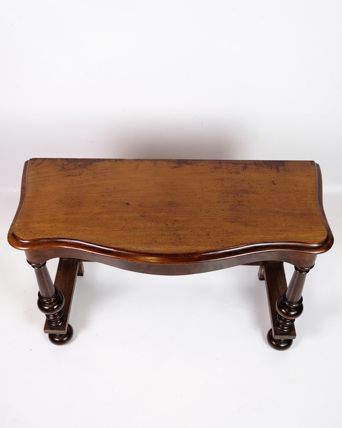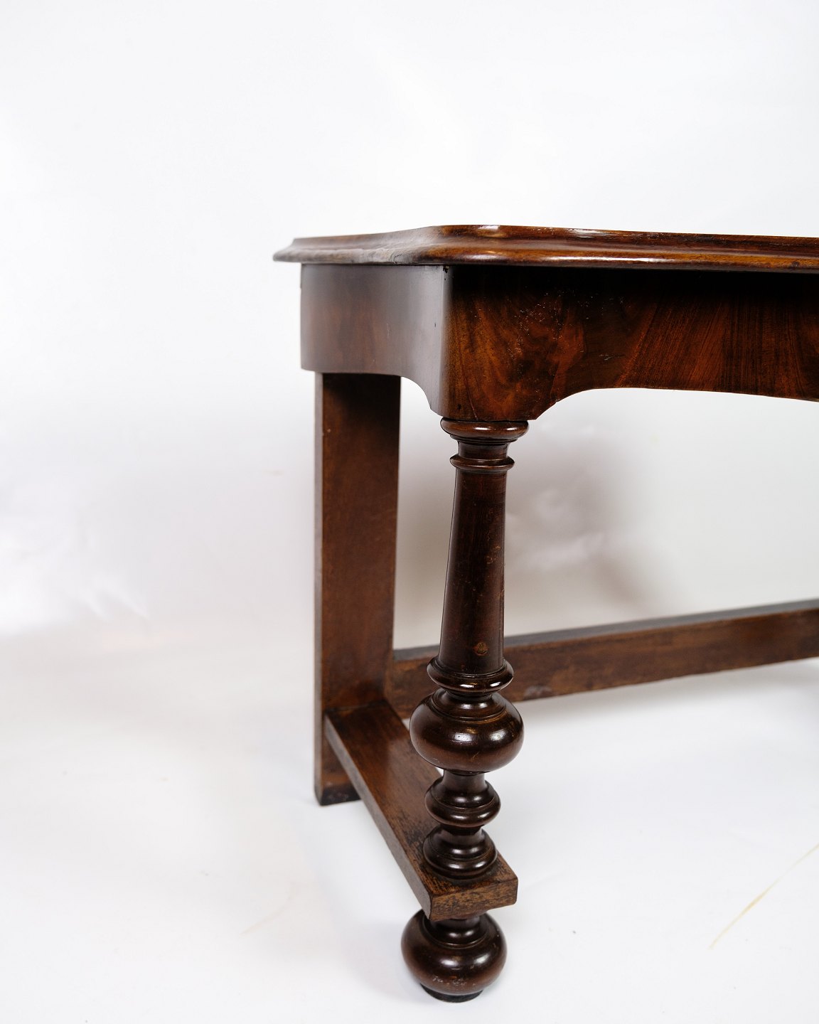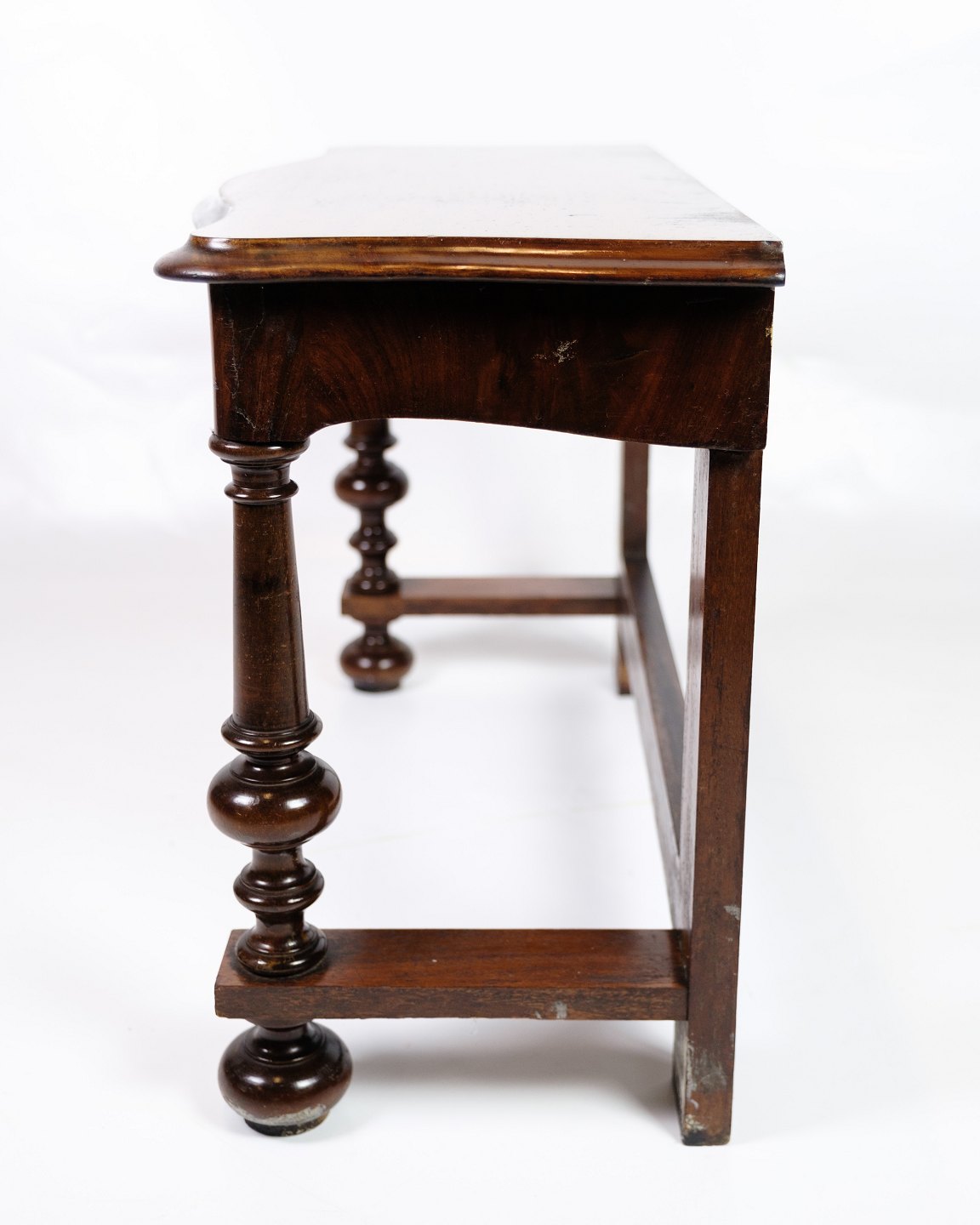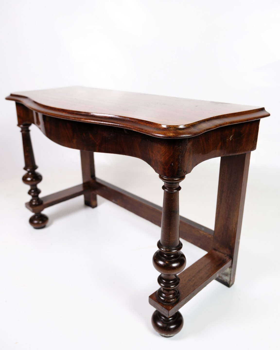 Console table or hall table from the 1920s, made of mahogany with round, elegantly turned legs. The table's slim design makes it ideal as a functional piece of furniture in the hall or as a console table in the living room. The warm color of the mahogany and its fine grain pattern reflect the period and craftsmanship typical of 1920s furniture production.