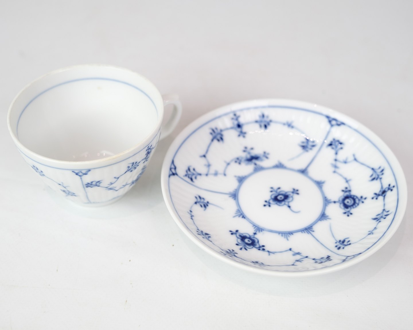 Tekop med underkop mærket 1/71 og 1/70 fra Royal Copenhagen, designet af Arnold Krog. Porcelæn med klassisk musselmalet riflet design. Håndmalet blå dekoration.