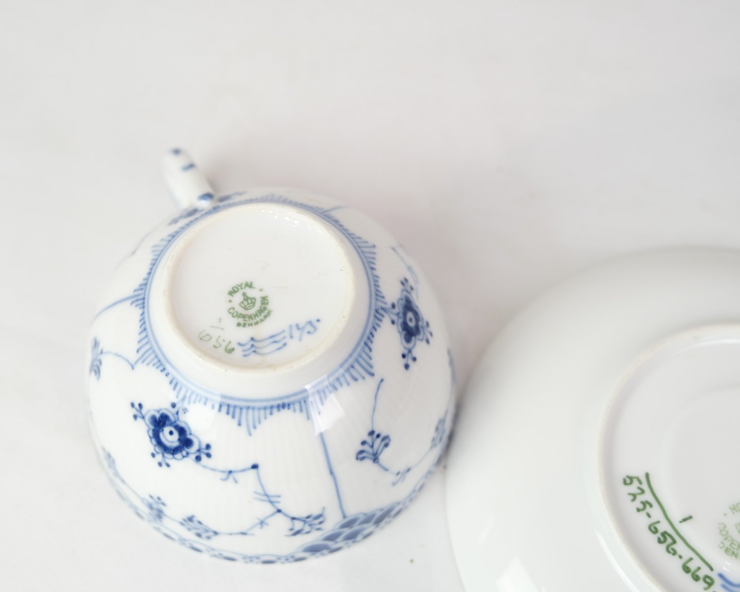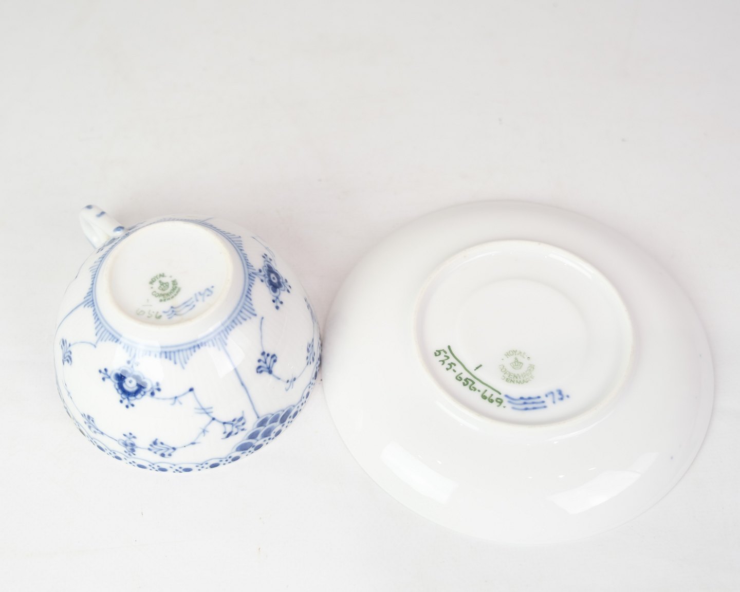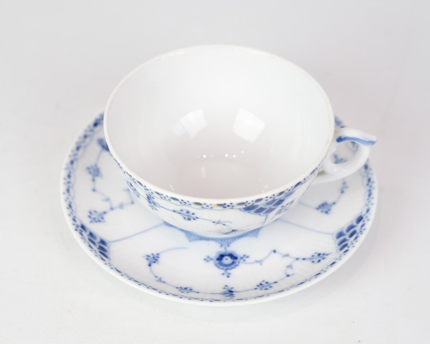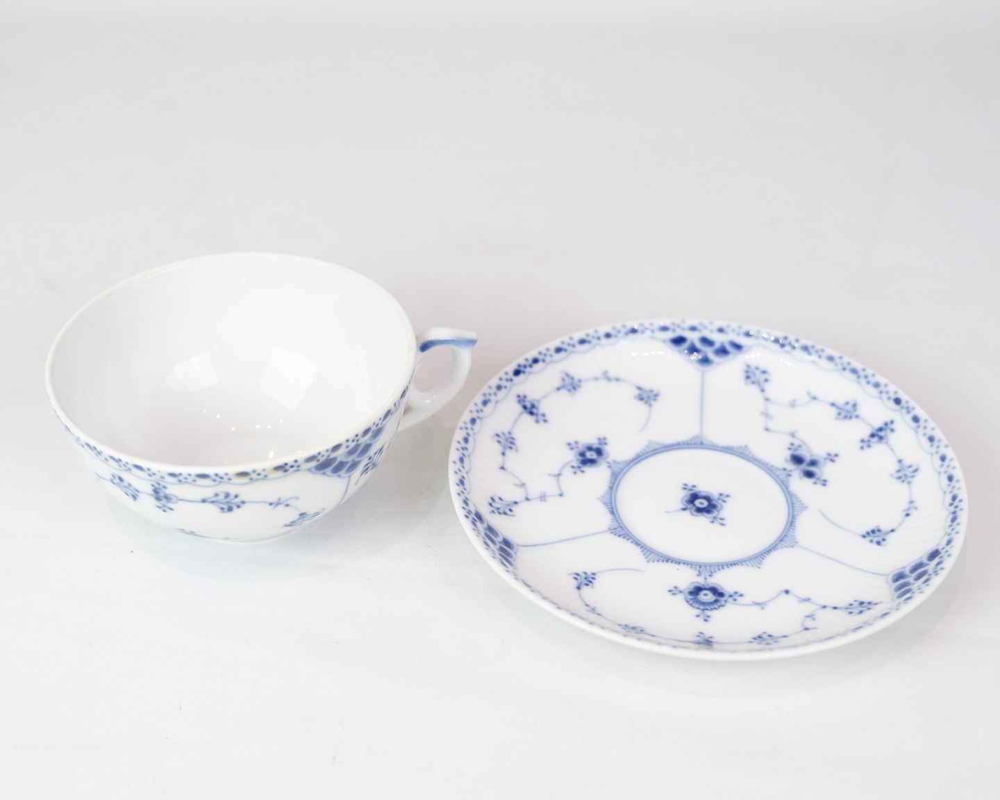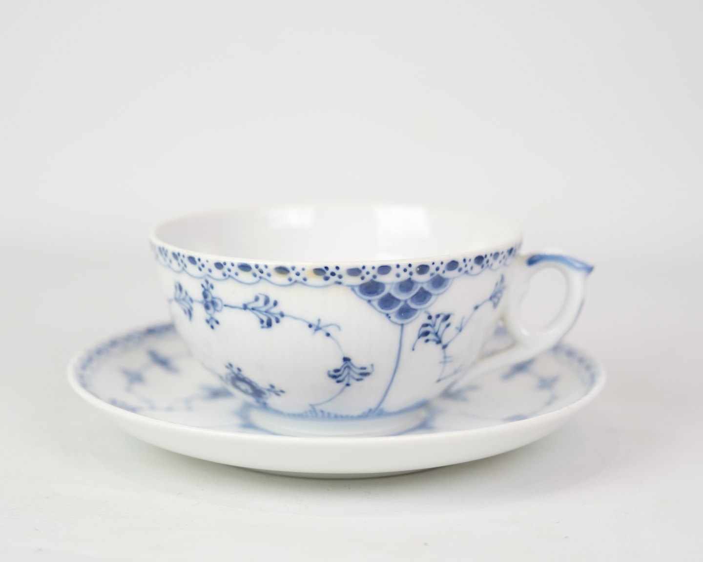 SoldTeacup with saucer of patterned blue fluting half lace model no. 656 with matching saucer.