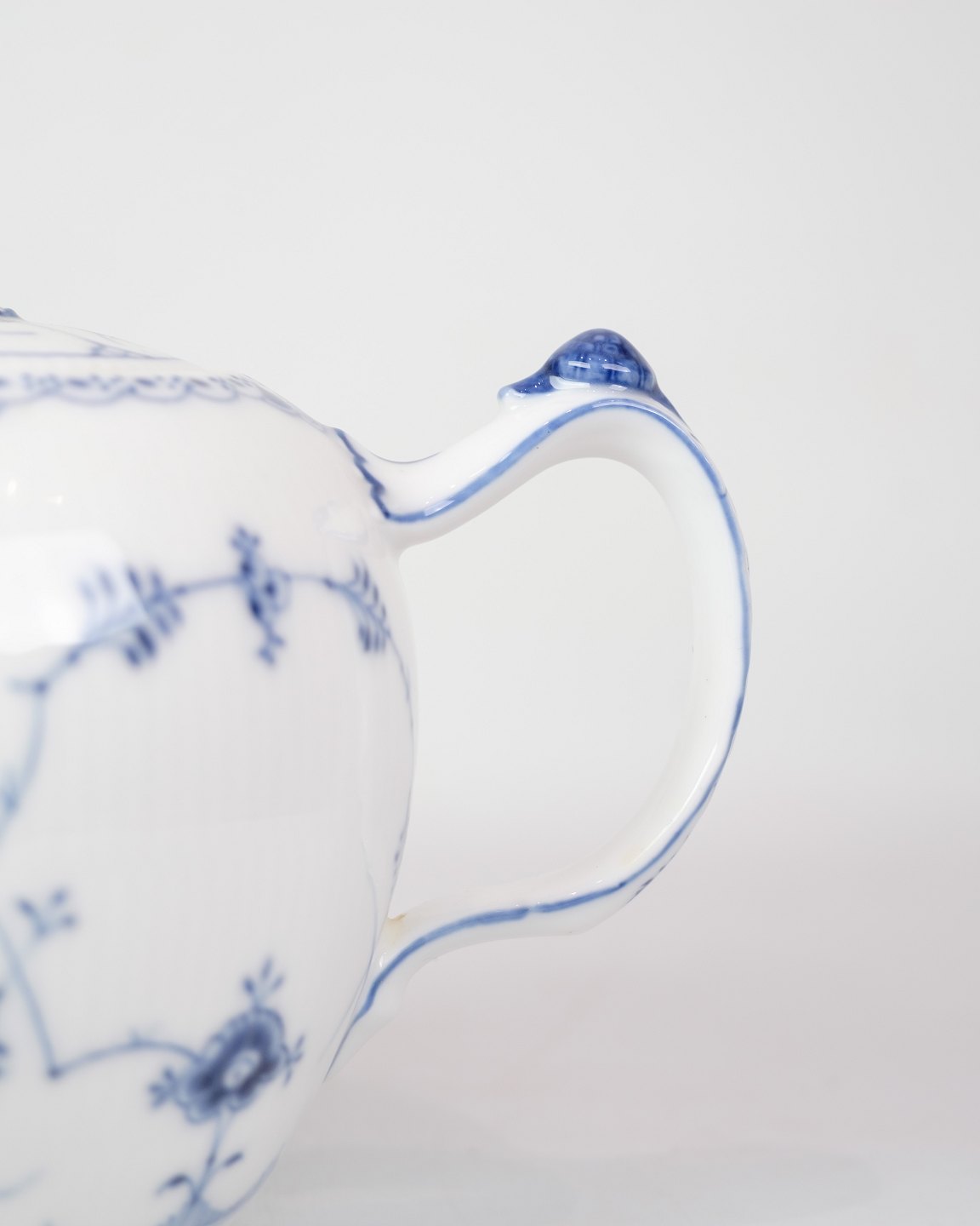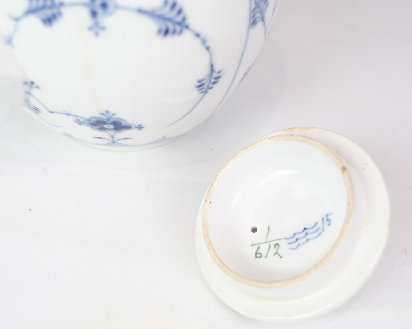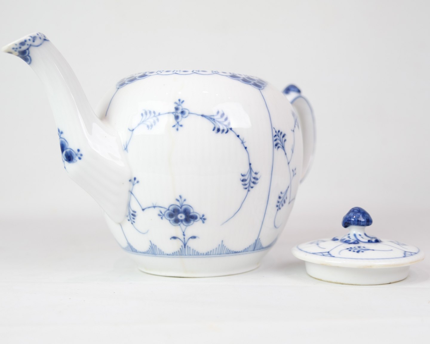 SoldLarge Teapot with Blue Fluted Fluted pattern by Royal Copenhagen model no. 612. Stands with beautiful blue hand-painted pattern.