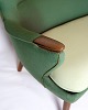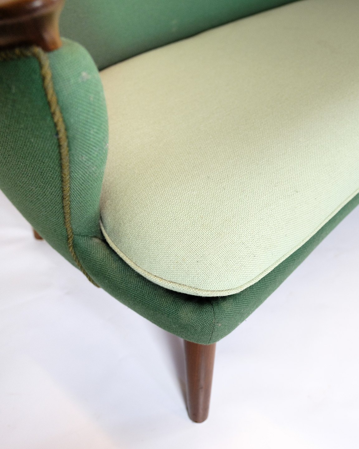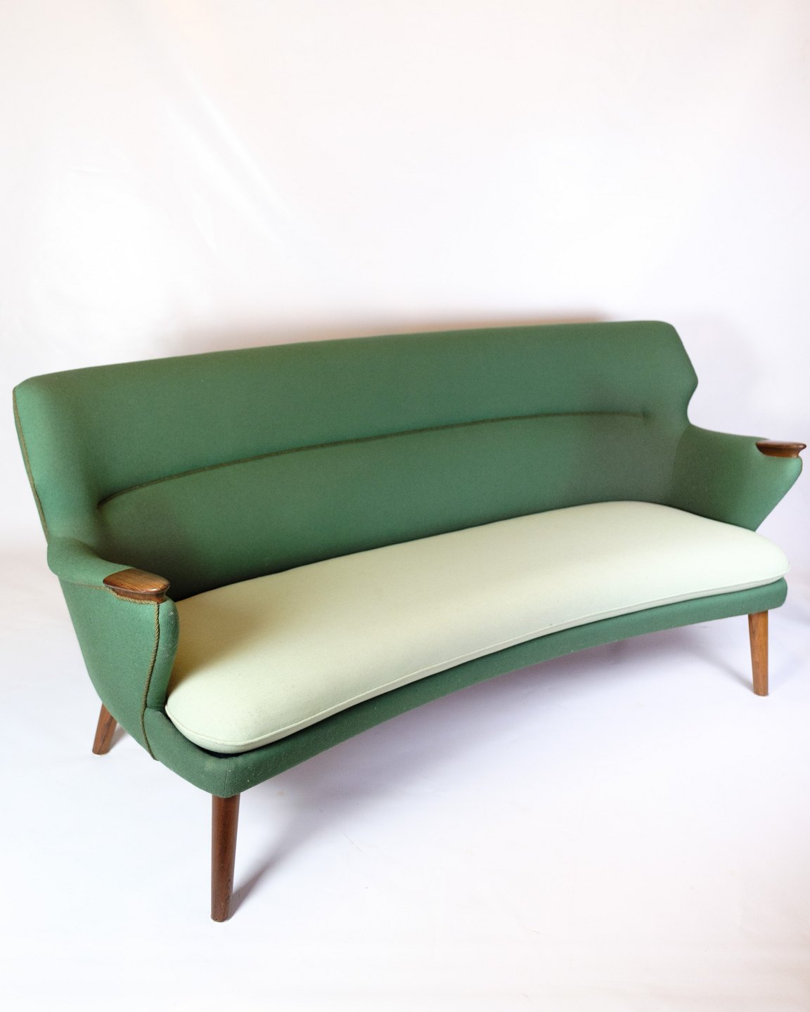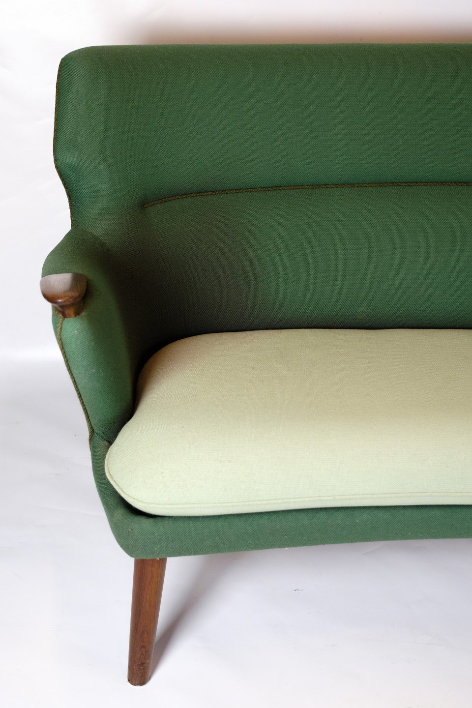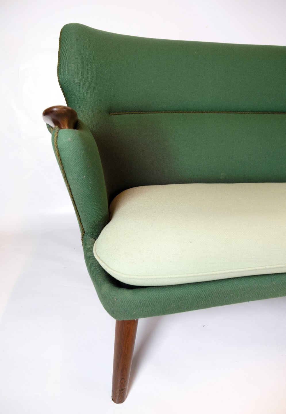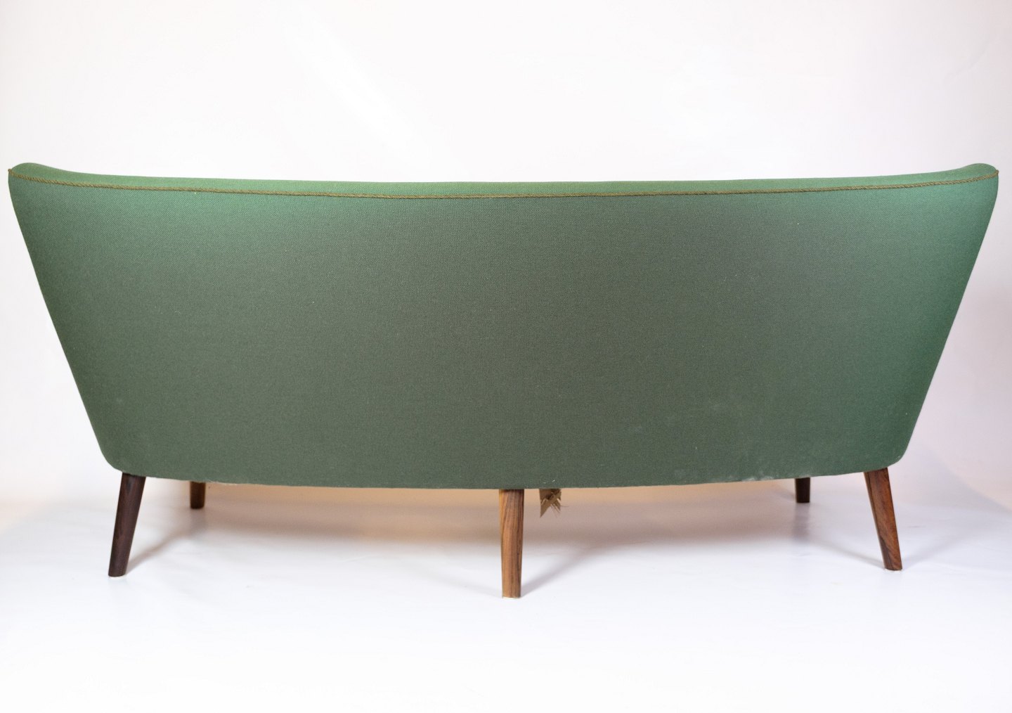 SoldGreen Sofa model 220, with light cushion cover by the Danish furniture architect Kurt Olsen. The sofa was made in the 1960s with high quality fabric with "nails" and legs of solid rosewood. The sofa appears in fine used condition with wear and tear.