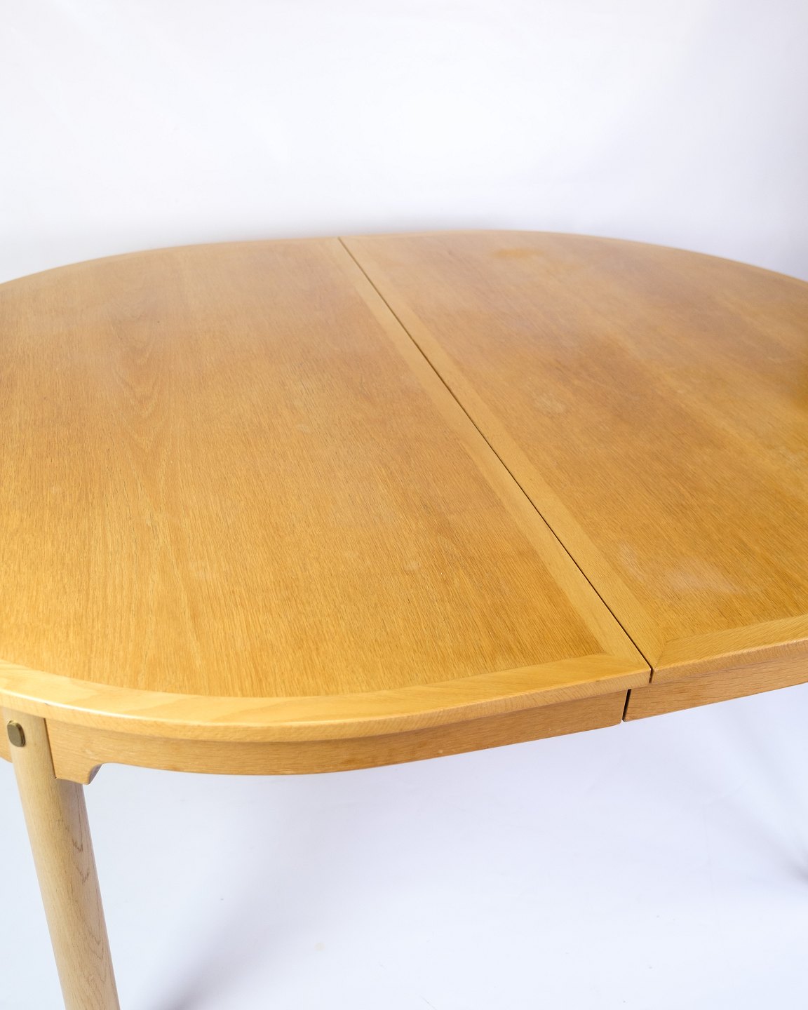 SoldOval dining table with extension from the "Øresundsserien", model 140, designed by Børge Mogensen and produced by Karl Andersson & Söner in the 1950s. The table is made of oak with solid oak legs mounted with brass fittings. It comes with four extension leaves and support legs for extra stability when fully extended.