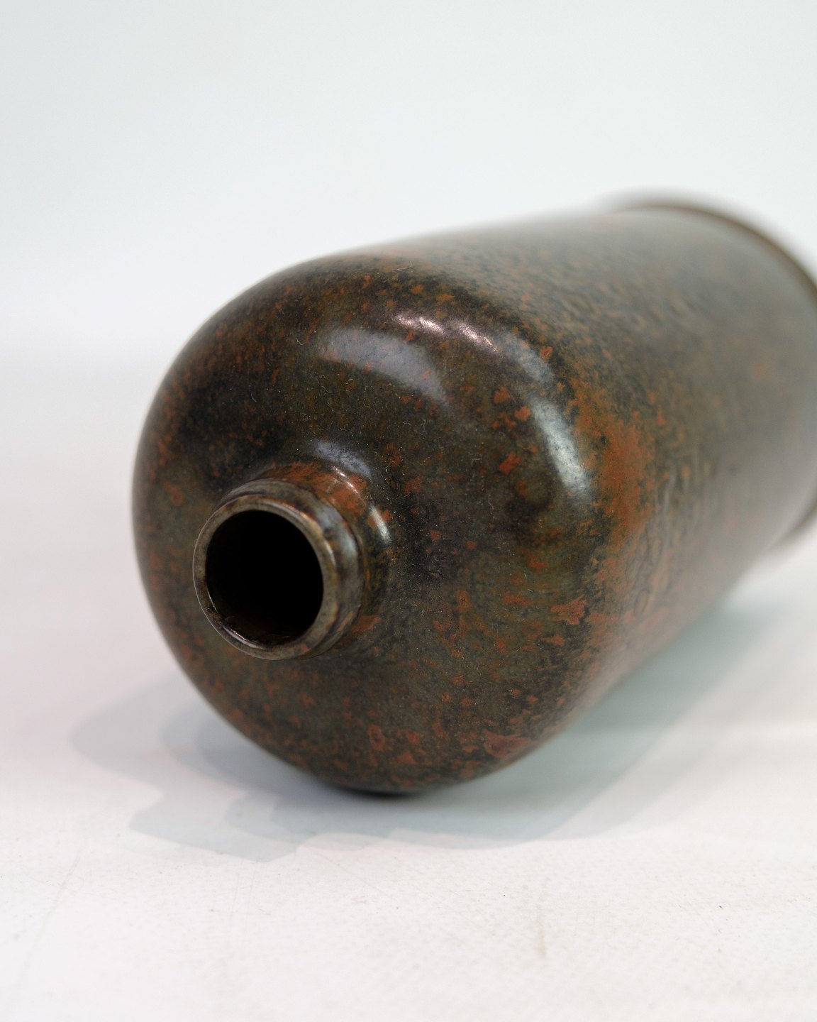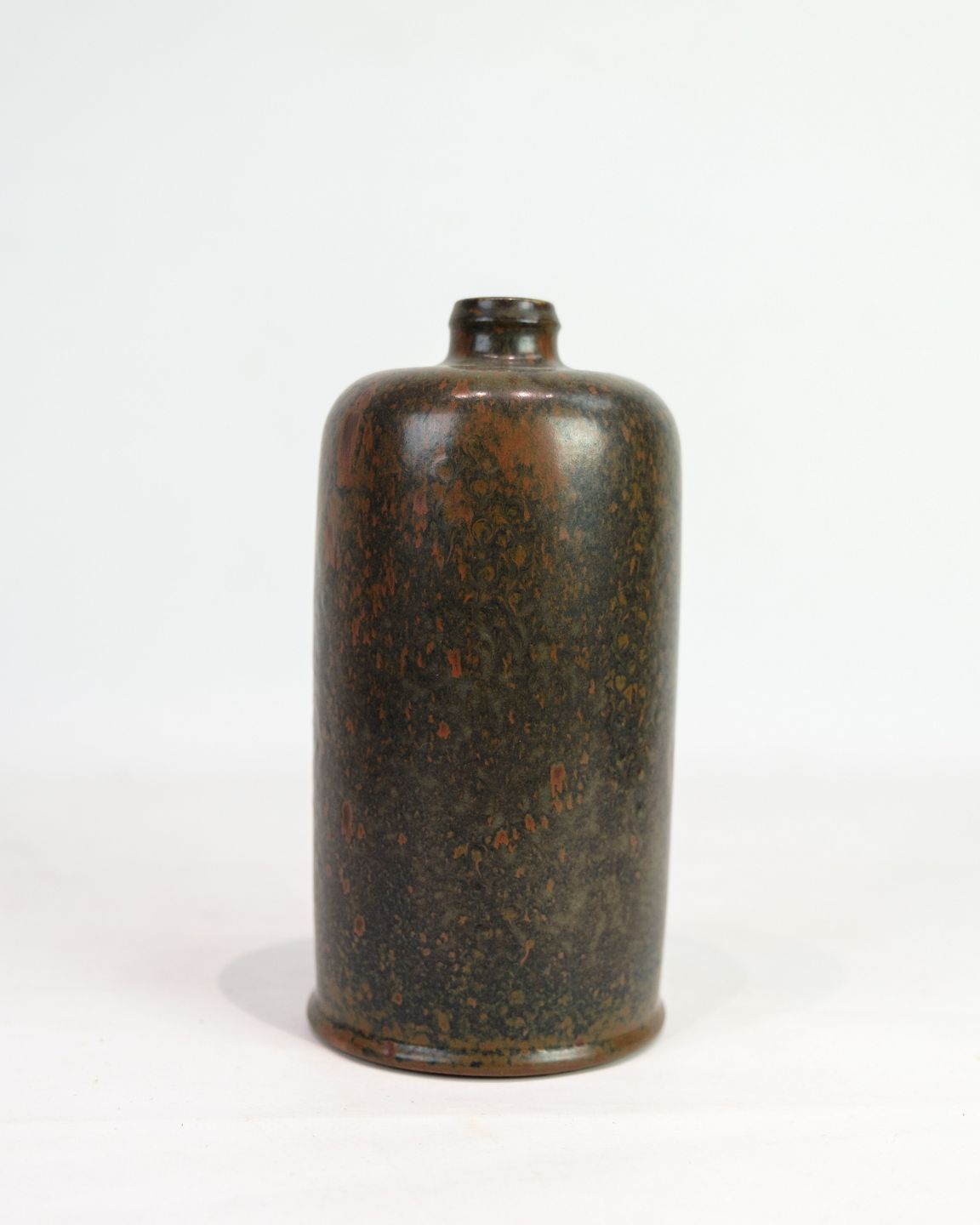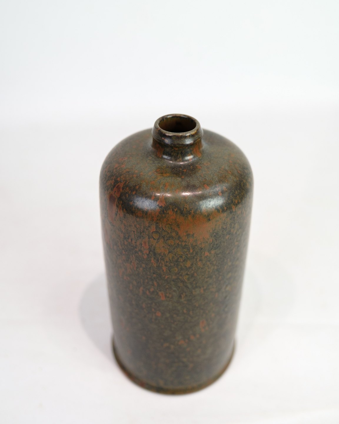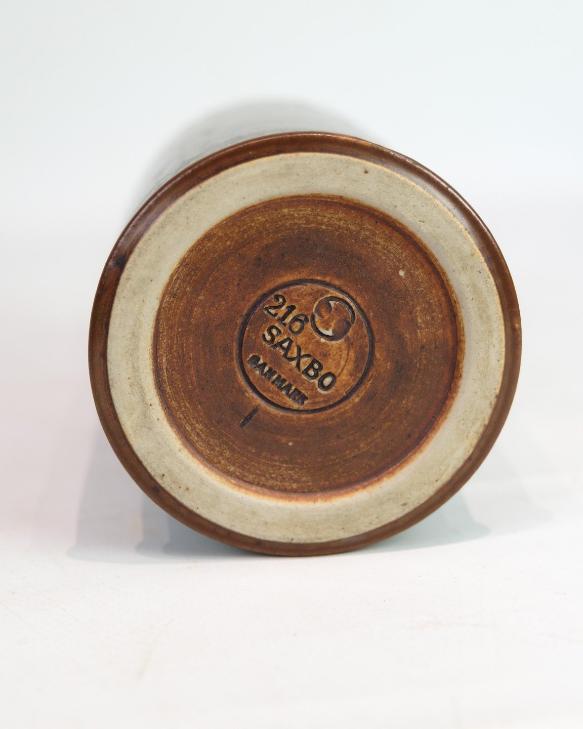 Saxbo blev grundlagt i 1929 af Nathalie Krebs og Franz Syberg og blev hurtigt kendt for sit teknisk præcise og æstetisk stramme stentøj. Krebs’ arbejder kendetegnes af enkle, skulpturelle former og eksperimenterende glasurer, som i denne vase, hvor farvespillet ændrer karakter med lyset og underlaget.