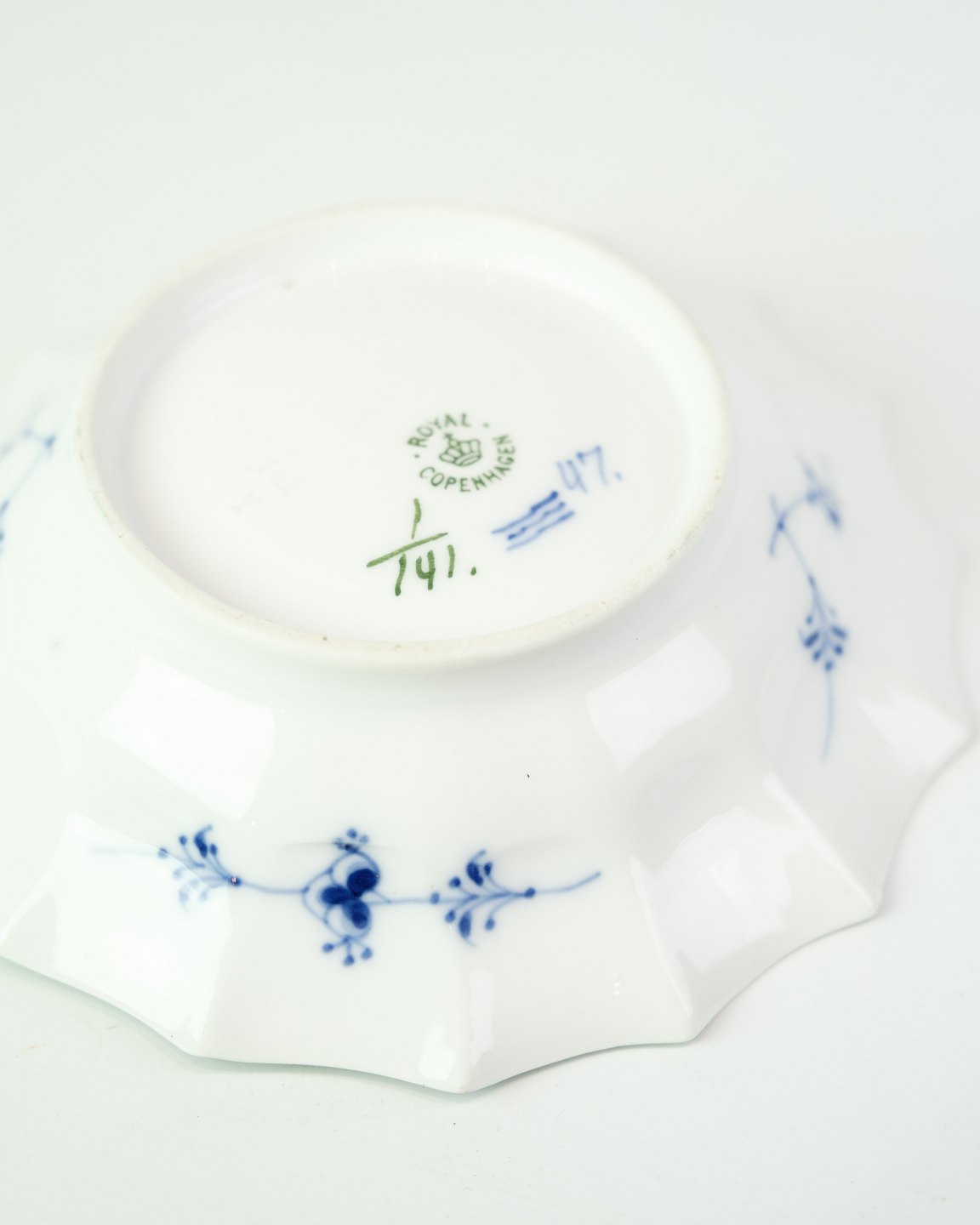 Asiet fra Royal Copenhagen i musselmalede mønster. Model No. 140 og er produceret i 1960. Udført i håndmalet porcelæn med den karakteristiske blå dekoration og riflet form, som kendetegner det klassiske stel.