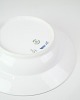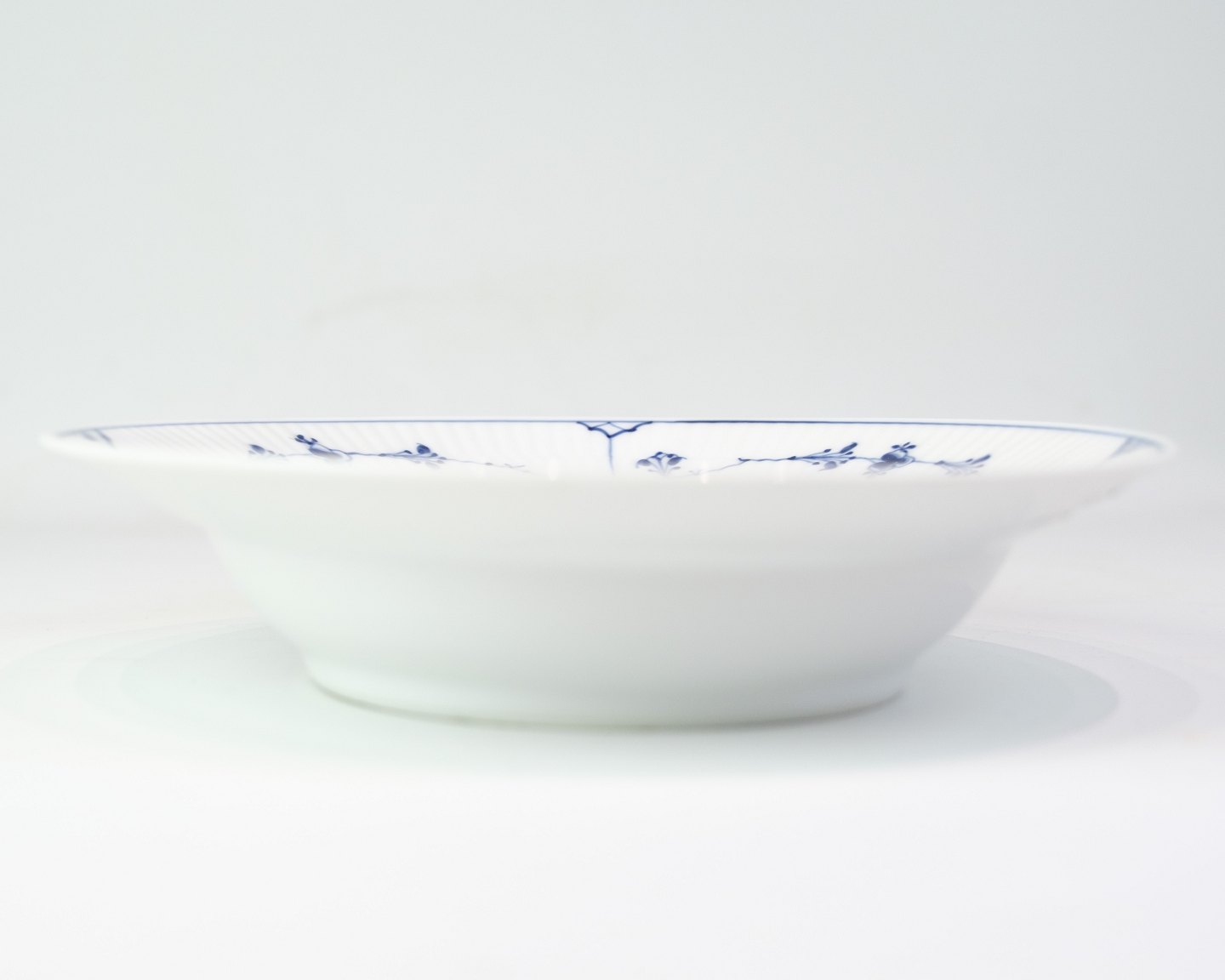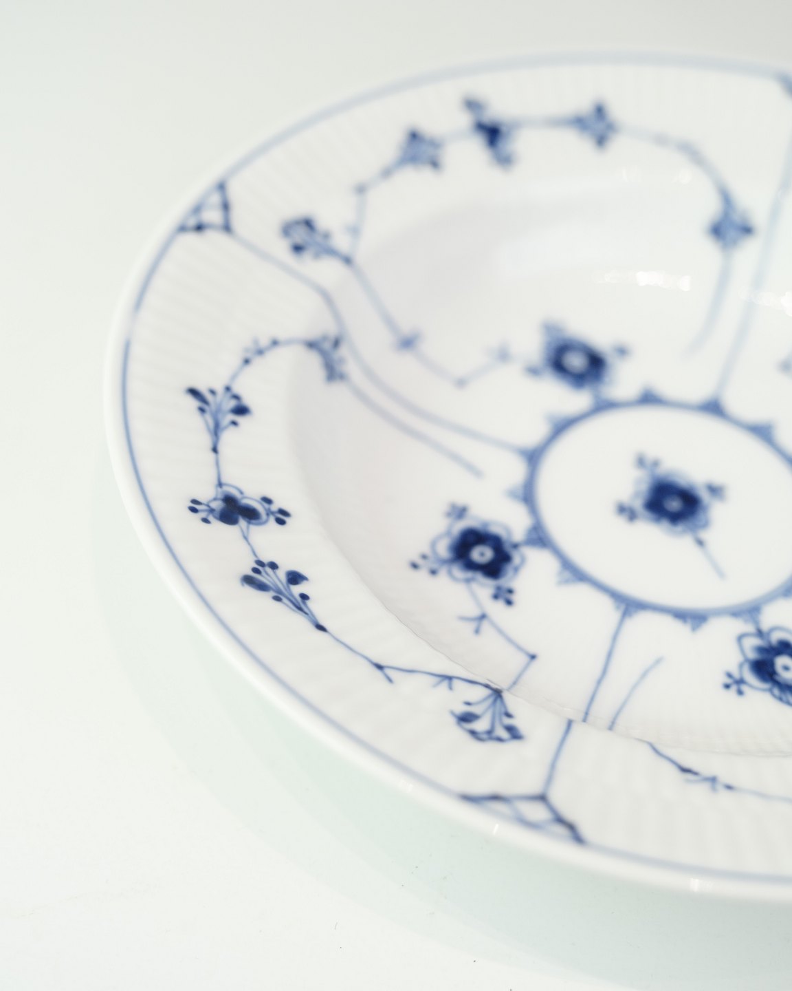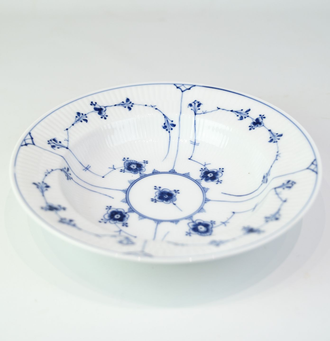 Tidlig tallerken fra Royal Copenhagen i det klassiske musselmalede riflet stel. Håndmalet porcelæn med koboltblå dekoration og den karakteristiske riflede overflade. Produceret før 1923, hvilket fremgår af bagsidestemplet uden bølgelinjer.