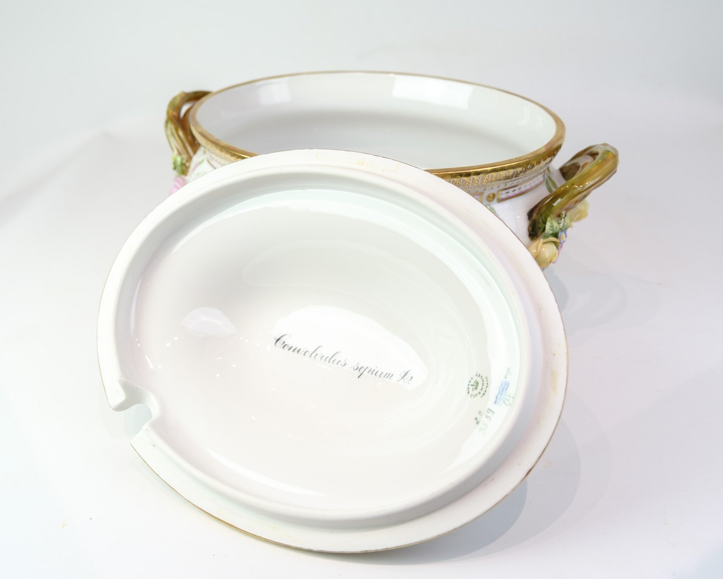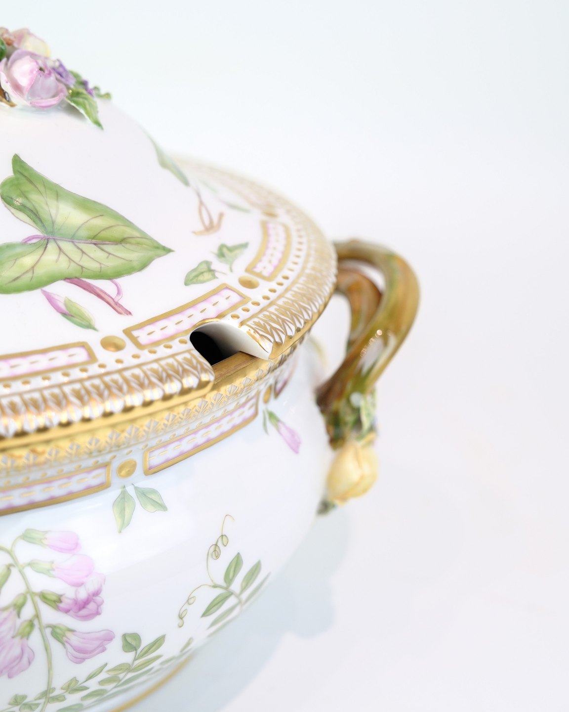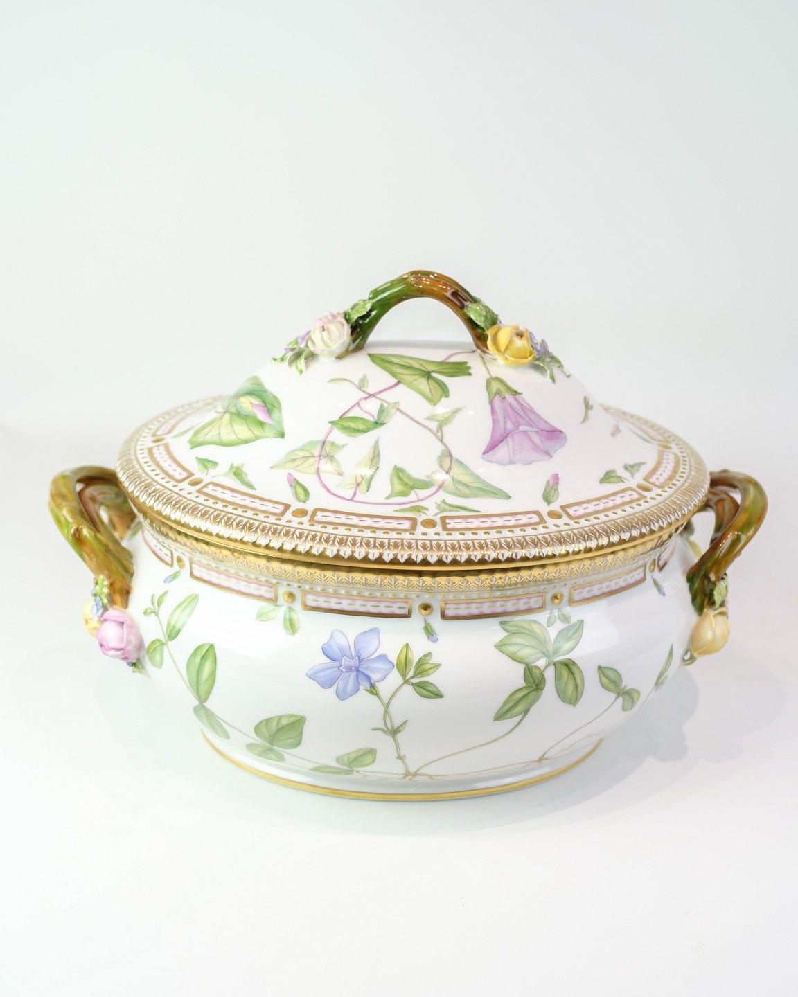 Kontakt os vedrørende prisTerrin fra Royal Copenhagens Flora Danica-serie, udført i porcelæn og håndmalet med dekoration nr. 20/3559. Terrinen er rigt dekoreret med naturtro blomster og forsynet med låghank og to sidehanke udformet som grenmotiver med blomster og blade i farver.
