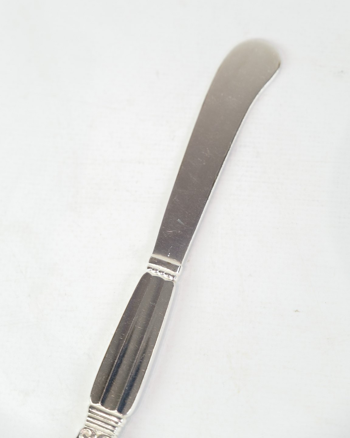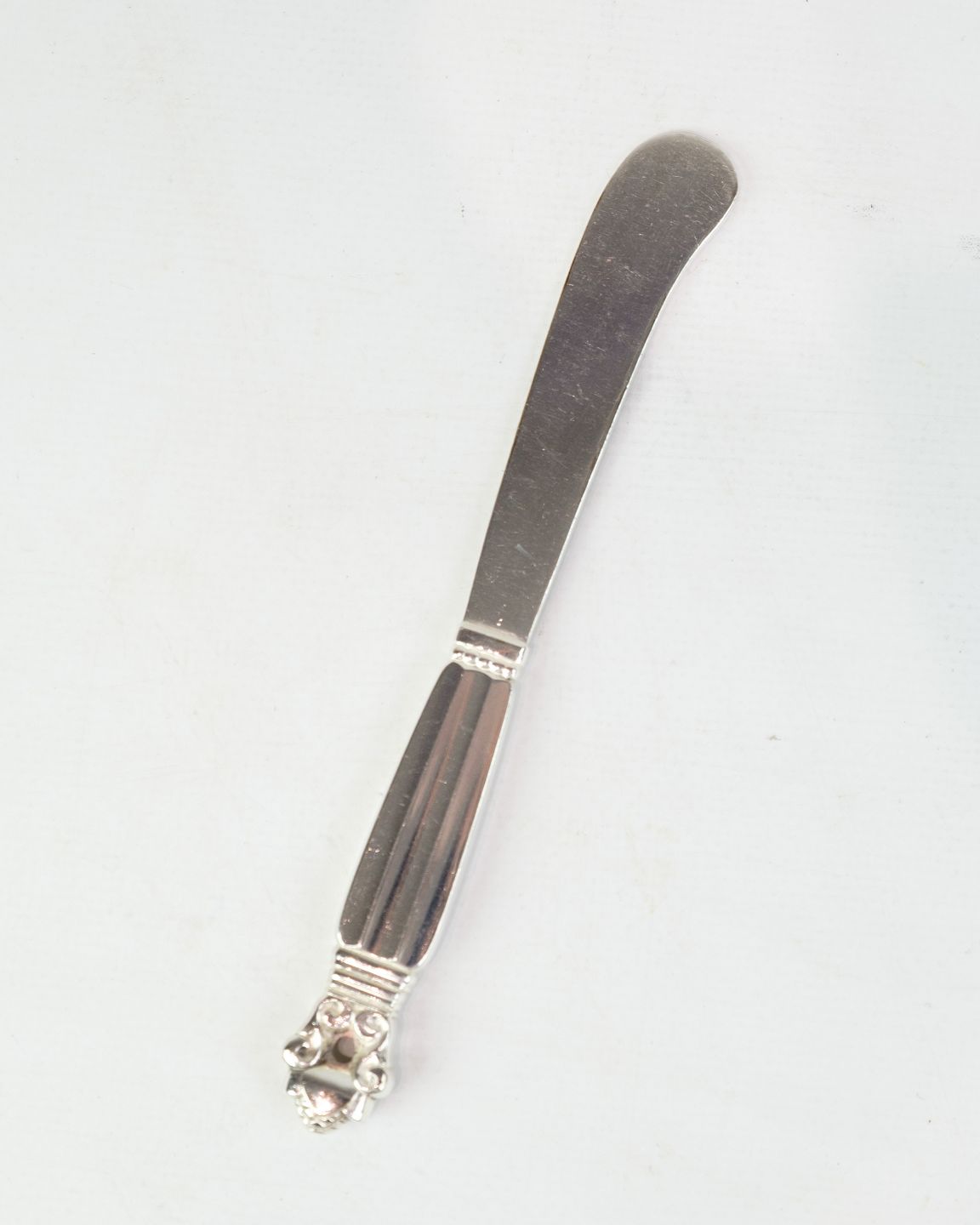 Georg Jensen smørkniv i sterling sølv. Konge mønster, design af Johan Rohde 1915. Model No. 046. Længde 15 cm.