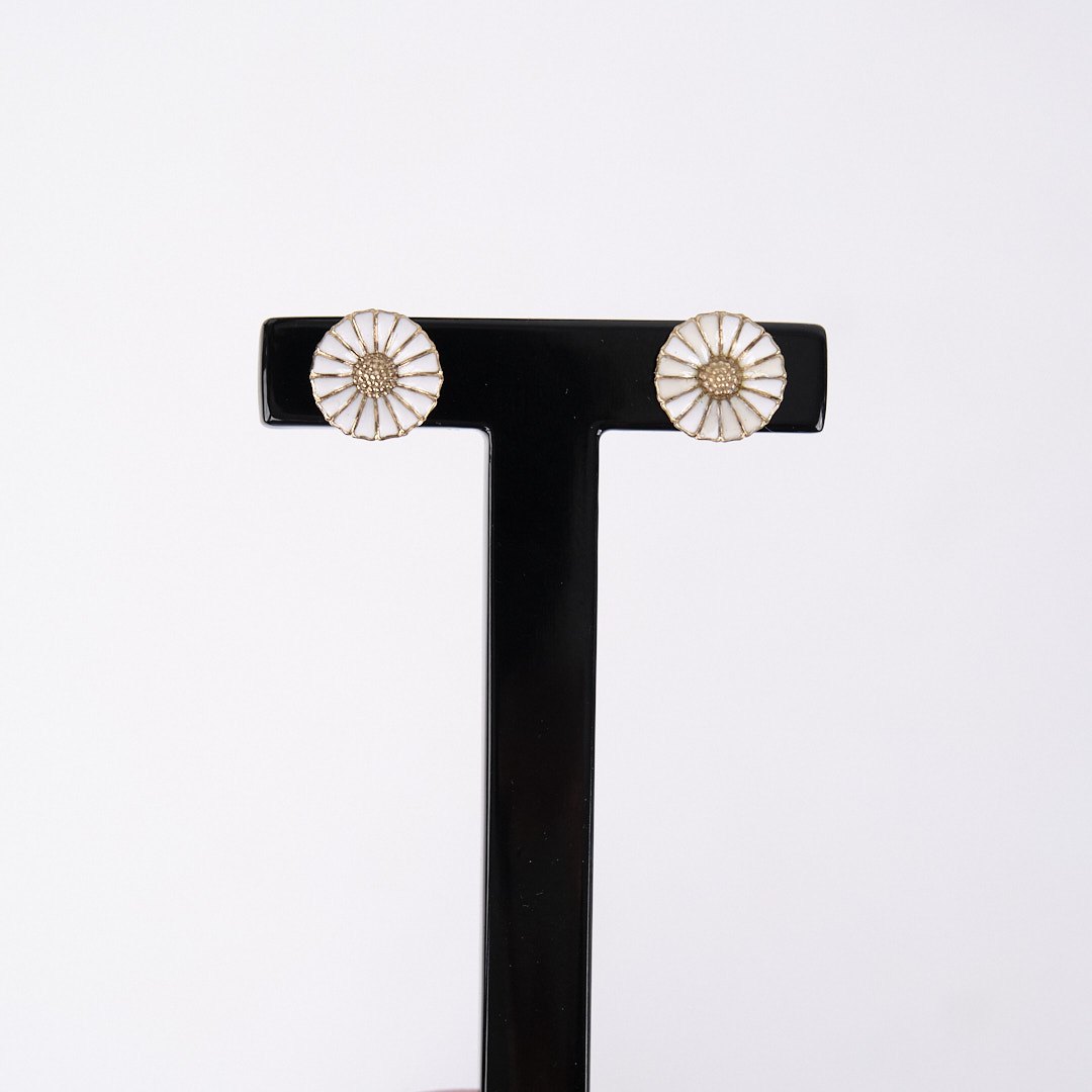 Marguerit øreringe fra 1940’erne, stemplet 925S i sterling sølv og forgyldt, udført af Anton Michelsen. Klassisk dansk smykkedesign med ikonisk margueritmotiv, kendetegnet ved fine detaljer og tidløs elegance. Et eftertragtet smykke fra en anerkendt dansk producent.