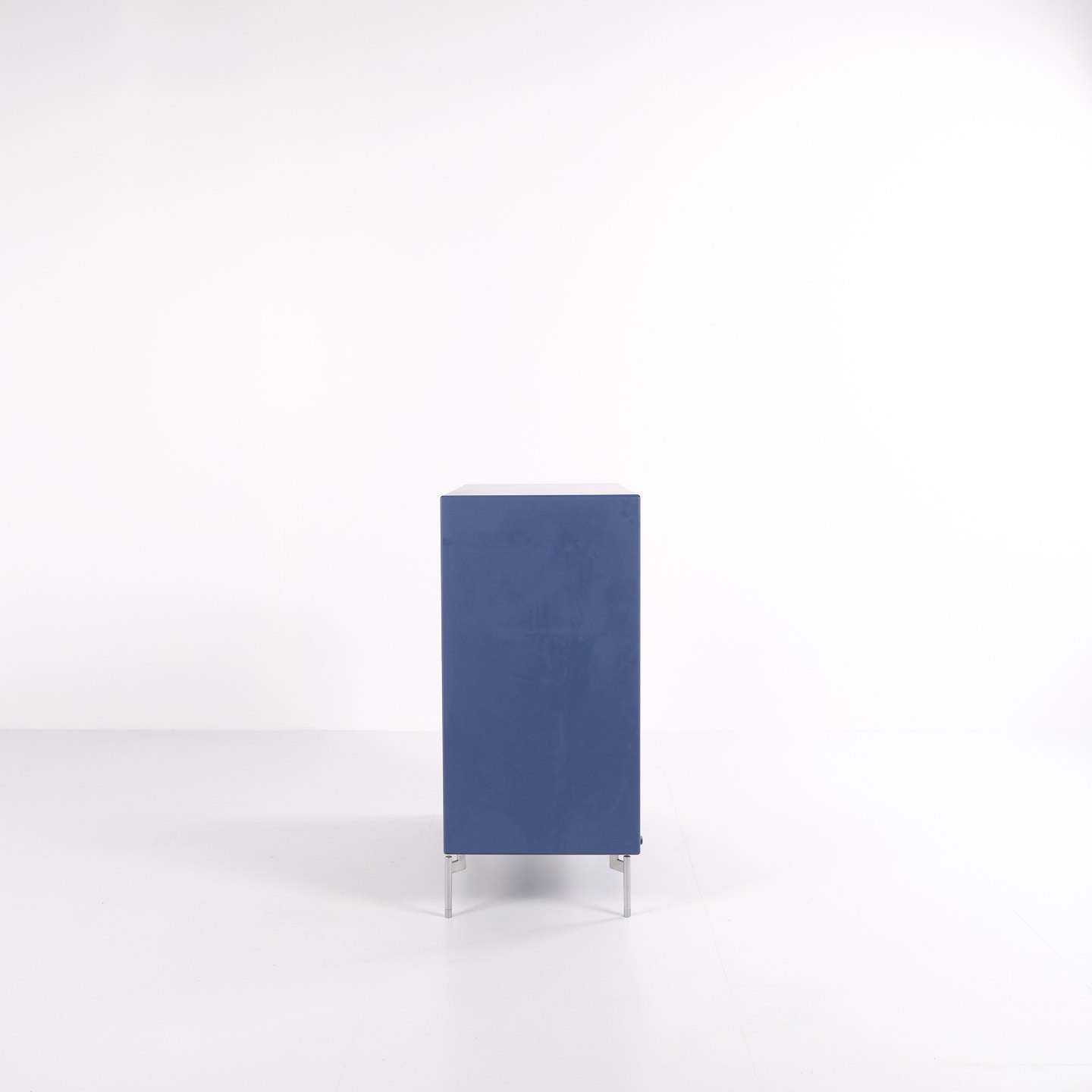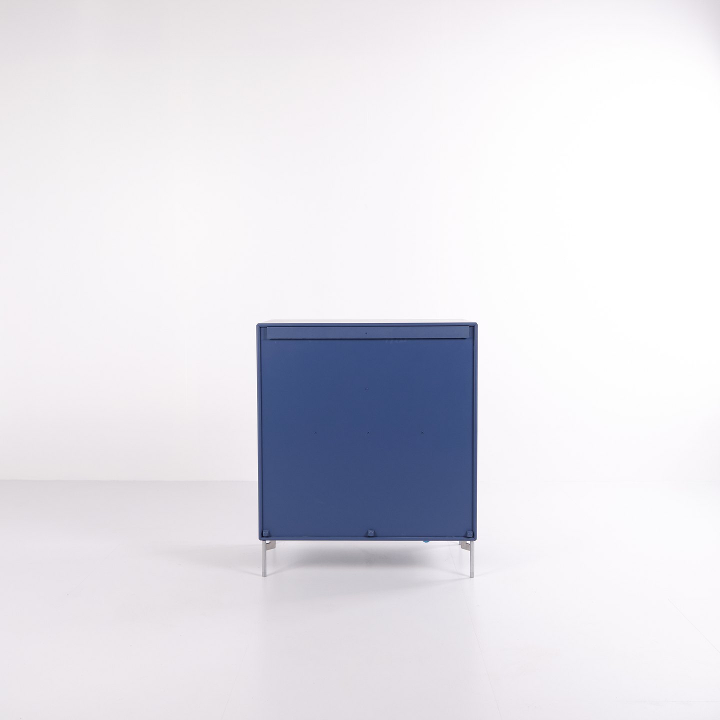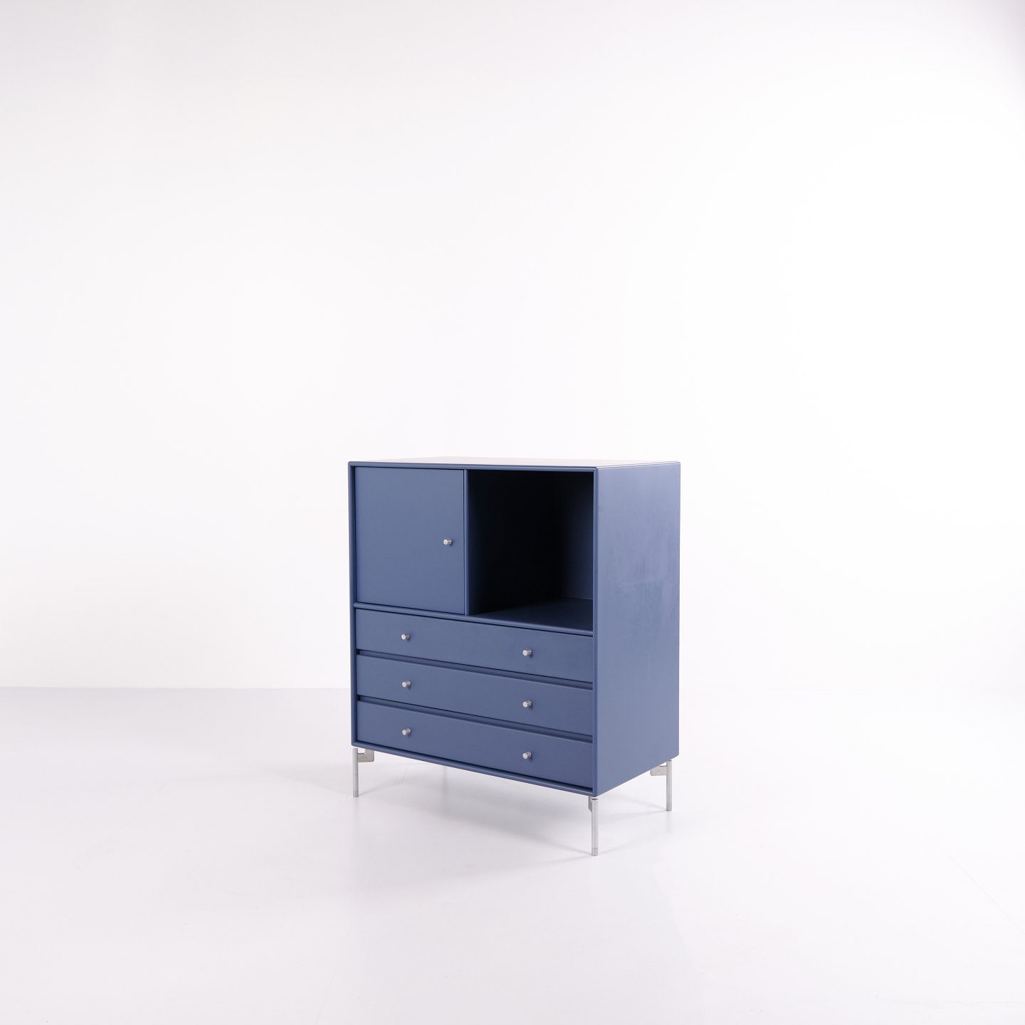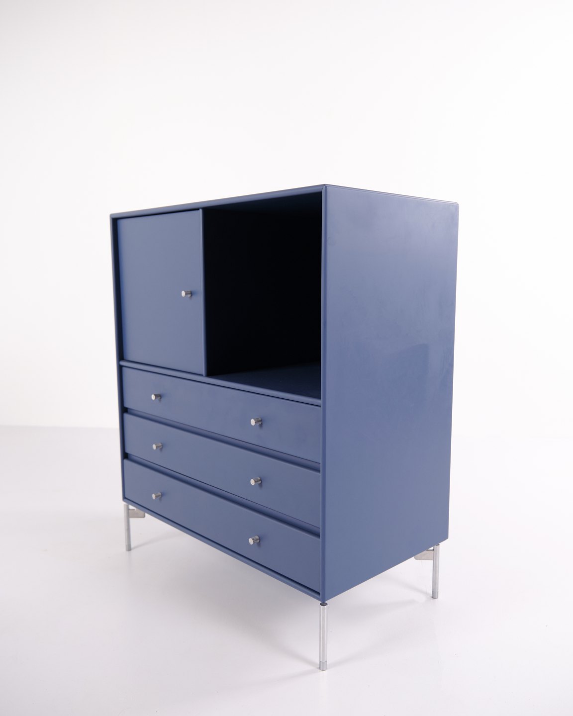 Montana chest of drawers in blue with chrome legs. Designed with three drawers and one door, offering practical and flexible storage. A classic Montana design with clean lines and high functionality.