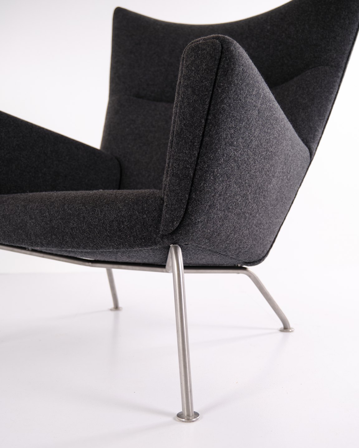 CH445 Wingchair designed by Hans J. Wegner and produced by Carl Hansen & Søn. Upholstered in grey Hallingdal fabric with matching footstool. A classic high-back Wegner model with distinctive wings and excellent seating comfort. A well-known Danish design icon.