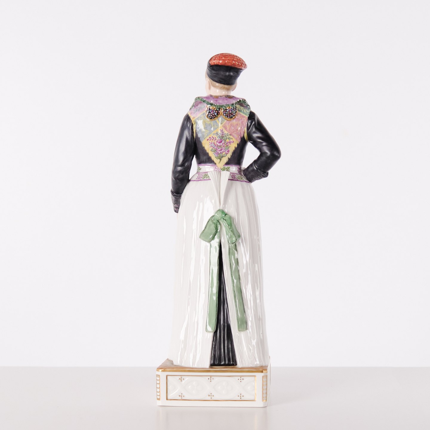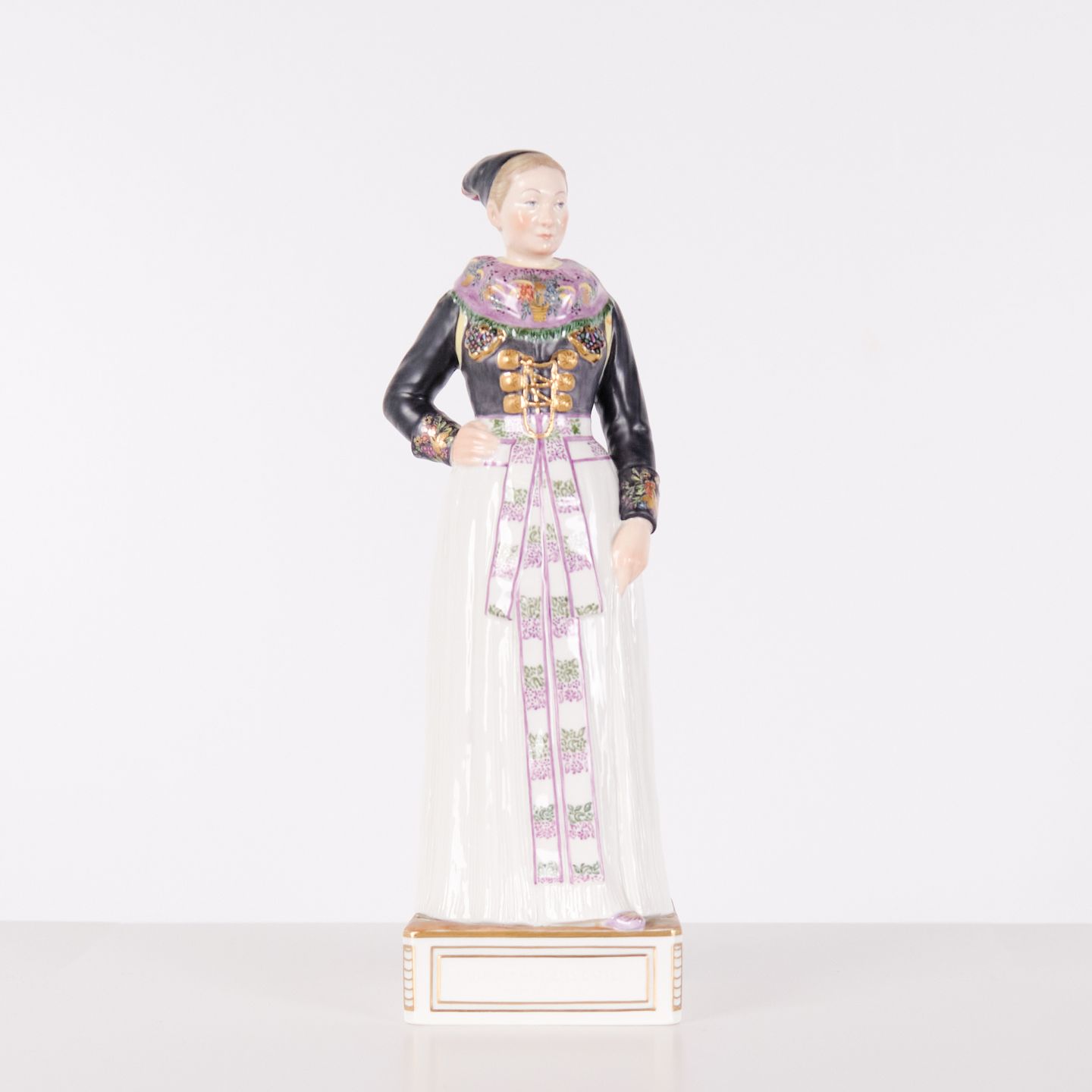 Overglasur porcelænsfigur i dansk nationaldragt, model 12104, forestillende kokkedragt fra Amager. Figuren er designet af Carl Martin-Hansen (1877–1941) for Royal Copenhagen og indgår i serien Danske Nationaldragter.