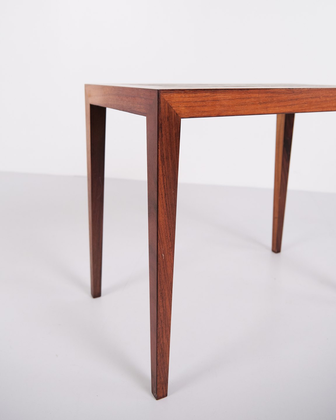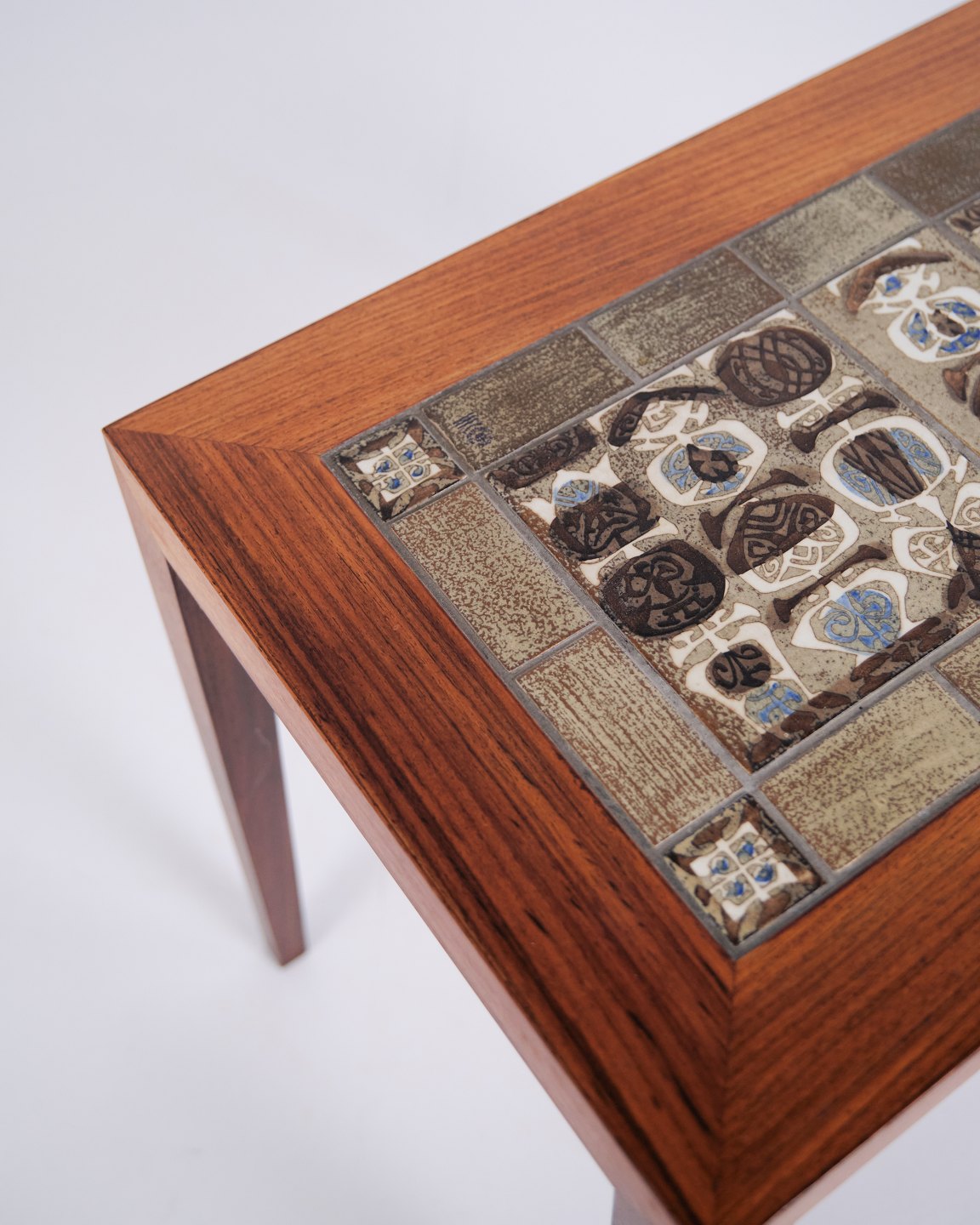 Side table, model 163, designed by Severin Hansen and produced by Haslev Møbelsnedkeri. The table is made of wood and features inset green faience tiles designed by Nils Thorsson for Royal Copenhagen. The combination of cabinetmaking and ceramic tiles is characteristic of Danish furniture from the 1960s.