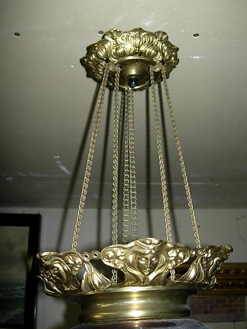 SolgtAmpel med flot materet glas i mørke rød farve med hoveder i forgyldt messing på top og bund fra år ca 1880