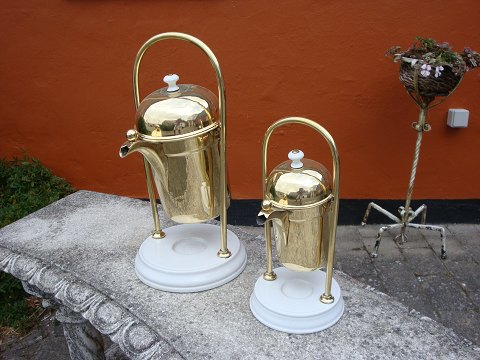 SolgtSuper flotte Messing apoteker vippe kander i stativ til fyrfad fra år ca 1920 .1800 kr for den store kande og 1400 kr for den lille