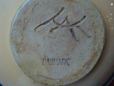 Round vase in a light color with blue / white stripes by Herman Kähler.