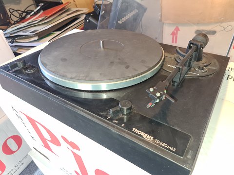Pladespiller fra Thorens model TD280MkII med ortofon pickup OMB 30. Spiller udmærket på 33 rpm, men har problemer med at komme op på 45 rpm. Hvis den hjælpes op i fart, holder den farten på de 45 rpm.