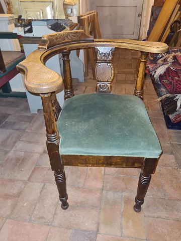 Hjørnestol i mørkbejdset egetræ med sæde betrukket i velor stof.