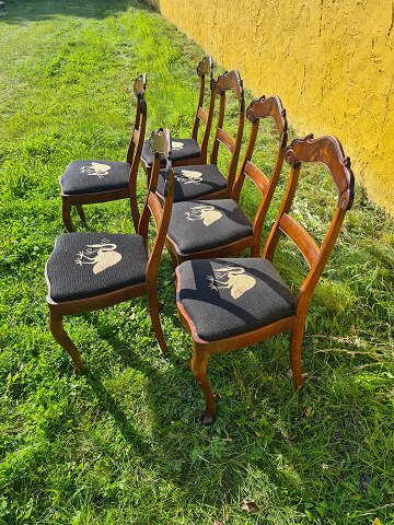 6 Salonstole fra 1920´erne i mahogni og med broderet sæde. Fremstår gode og ok stabile uden de store brugsspor.