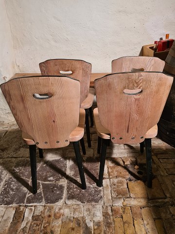 4 spisebordsstole i fyr med ludbehandlet ryg og sæde og sortmalede ben. Fremstår udmærket stabile.