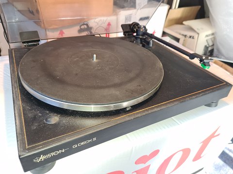 Ariston pladespiller model Q Deck II med ortofon pick´up. Testet og virker. Strømforsyning medfølger, men har brug for en TTPSU hvis den skal køre andet end 33 rpm. Lettere overflade ridset på cover.