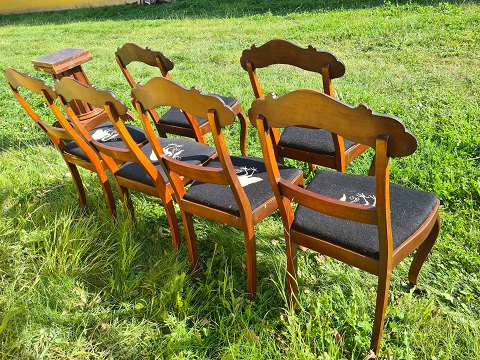 6 Salonstole fra 1920´erne i mahogni og med broderet sæde. Fremstår gode og ok stabile uden de store brugsspor.