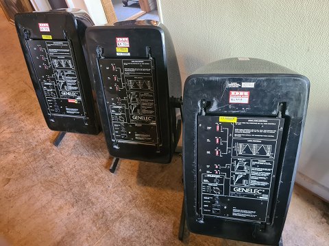 3 GENELEC TRIAMP 1022A gulvhøjtalere. Testet og virker. Fremstår med brugsspor i form af overfladeridser. Kommer med ophæng i metal. Yderligere medfølger 3 stk. der er til reservedele/restaurering. 1 hvor bassen er kaput. 1 der ikke kommer lyd ud af og 1 tomt kabinet. Diverse strøm- og tilslutningkabler medfølger ligeledes.