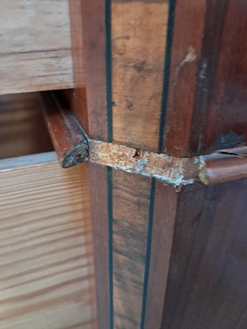 Den har brugsspor, har et hak i toppen (billede) og mangler en hjørne liste.